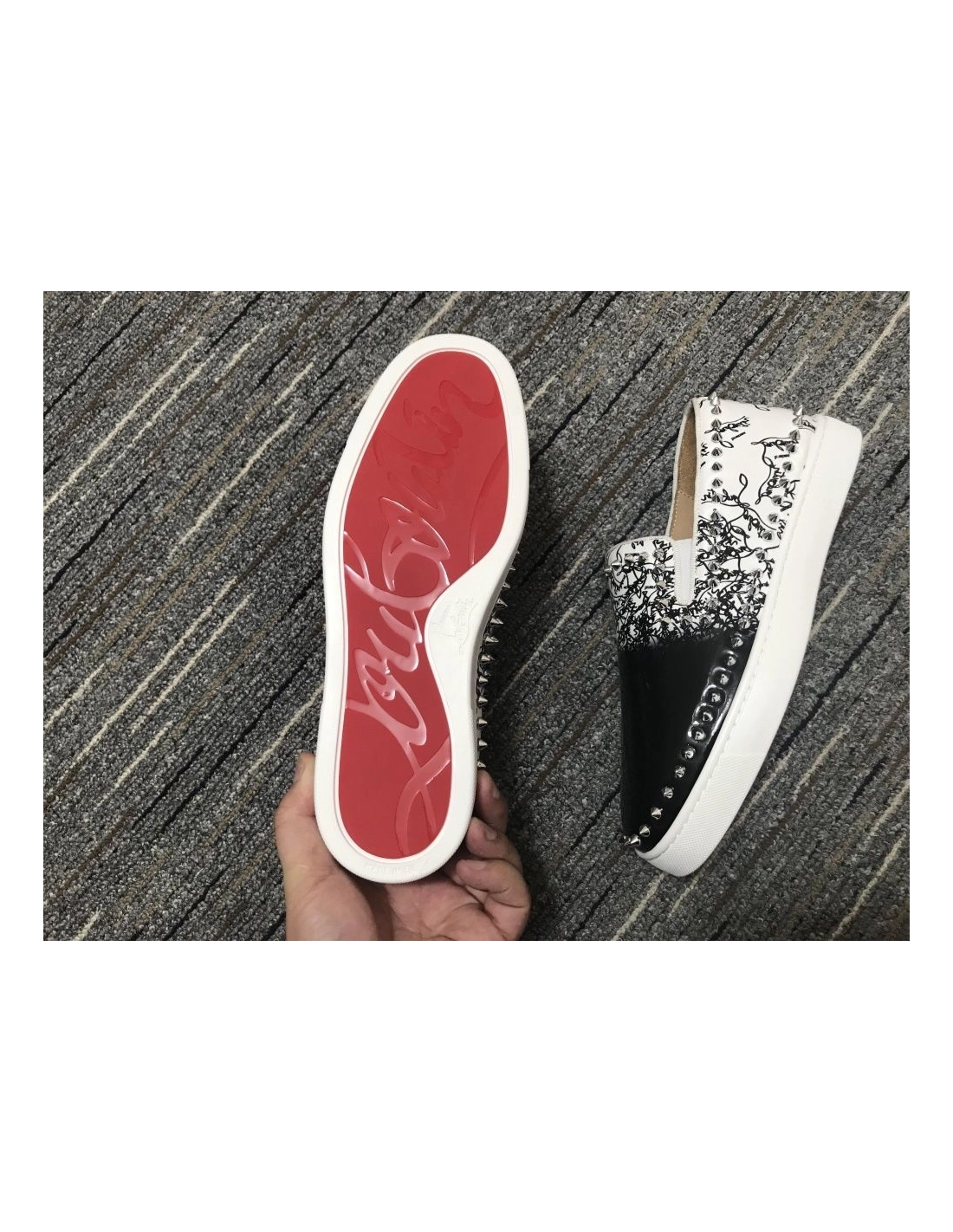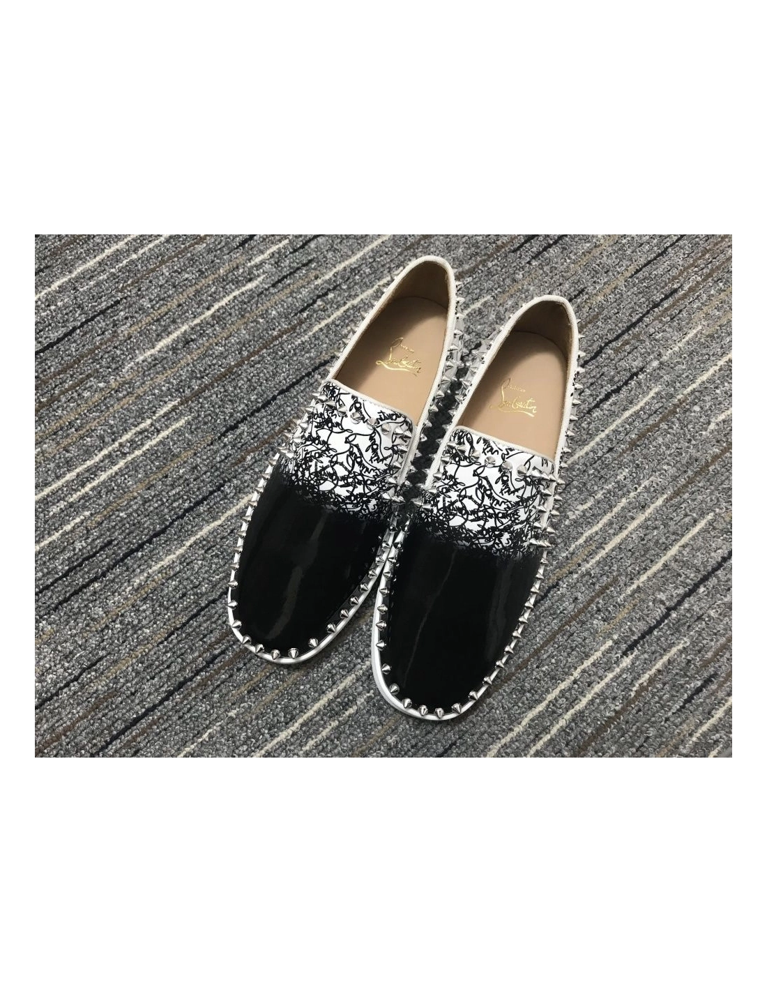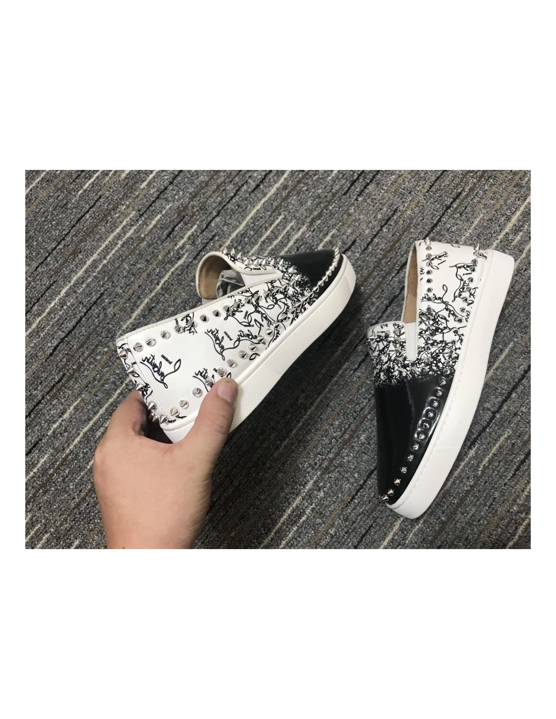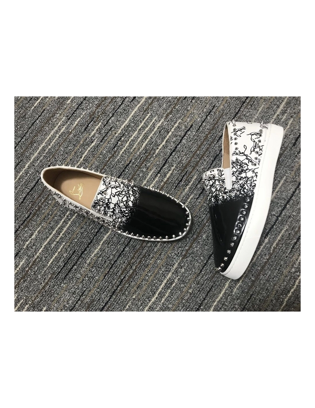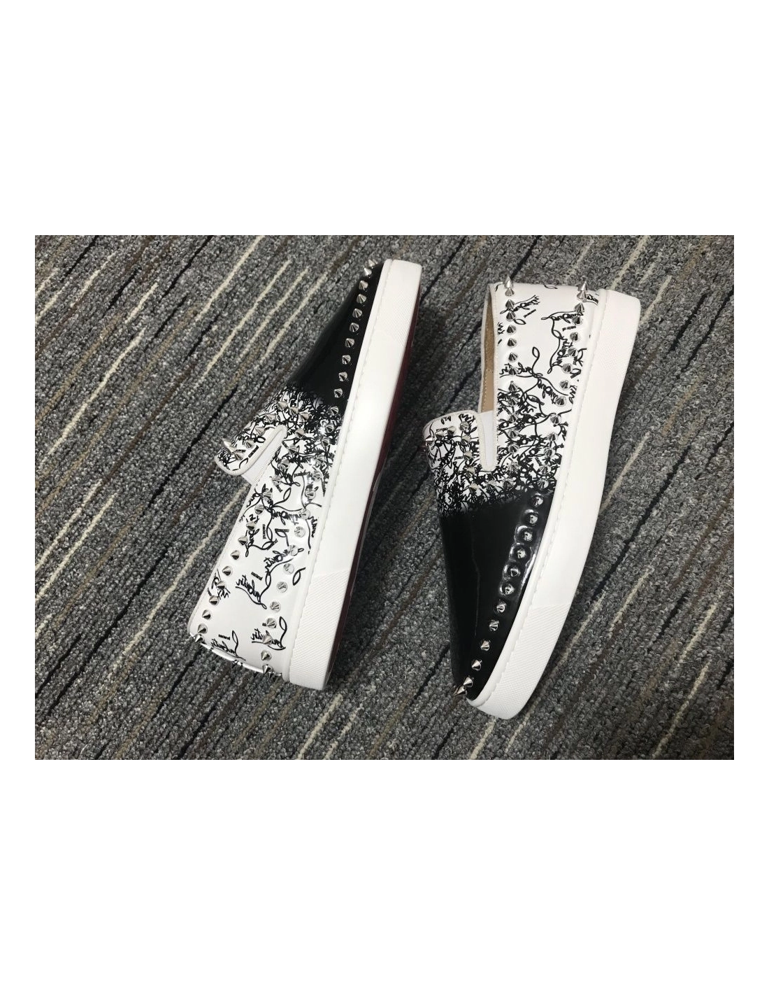 Fake Christian Louboutin Pik Boat Spikes Slip-on Sneakers Patent Leather Black White