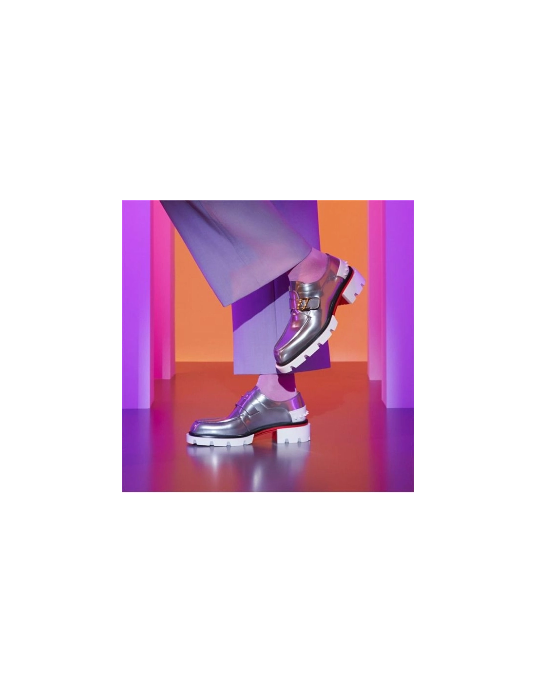 Set stop a chunky lug sole and designed for ultimate comfort and longevity, the Our Georges is a city shoe to take you anywhere. The exaggerated welt and ultra-light TPU sole create a strong signature and the moccasin apron features a roomy toe box ideal for wider feet. Christian Louboutin Derby Our Georges Silver Antispecchio the lace-up version showcases short lacing with modern metallic eyelets and a sporty elongated heel tab, a striking Antispecchio upper creates an urban finish.Color :SILVERMaterial : ANTISPECCHIOCollection : Summer 22