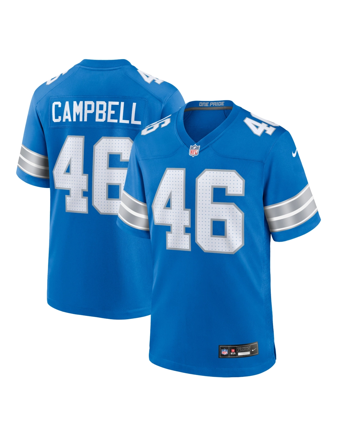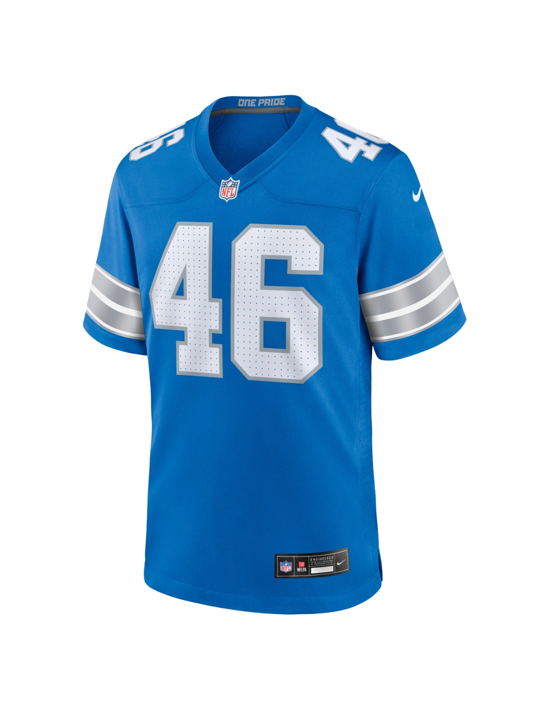 Sewn-on NFL Shield at collar and satin twill woven jock tag at hem