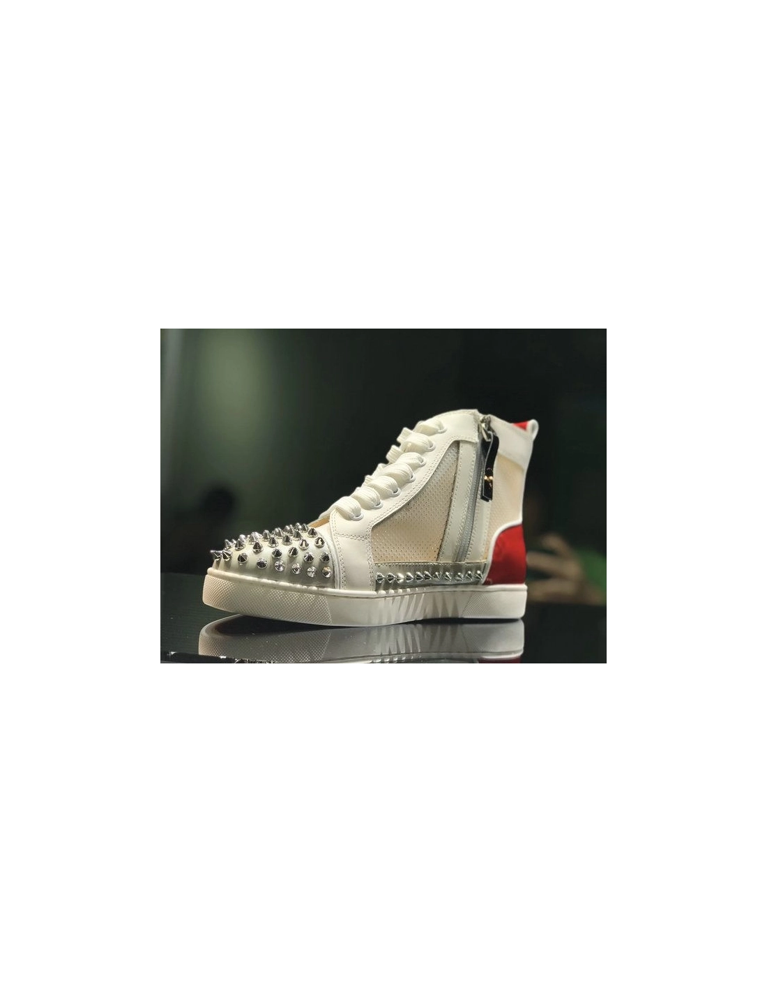 Christian Louboutin Sosoxy Spikes High-Top Sneakers Mesh and Leather Multicolor that portrays an innovative and daring style. This model is designed using translucent PVC for the quarter. Signature silver spikes are affixed on the front and the sides. It comes with a pair of white socks wearing the signature of Christian Louboutin.