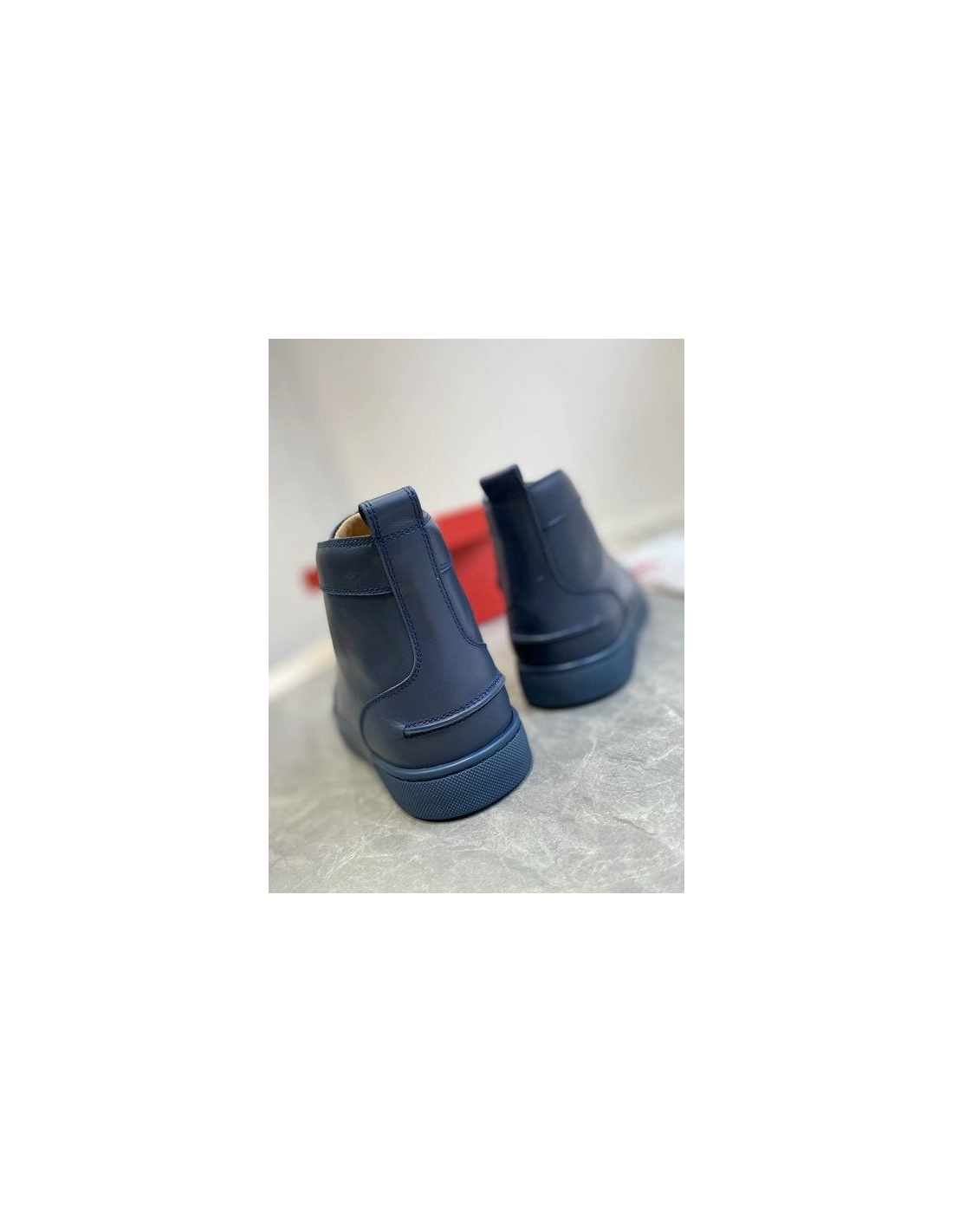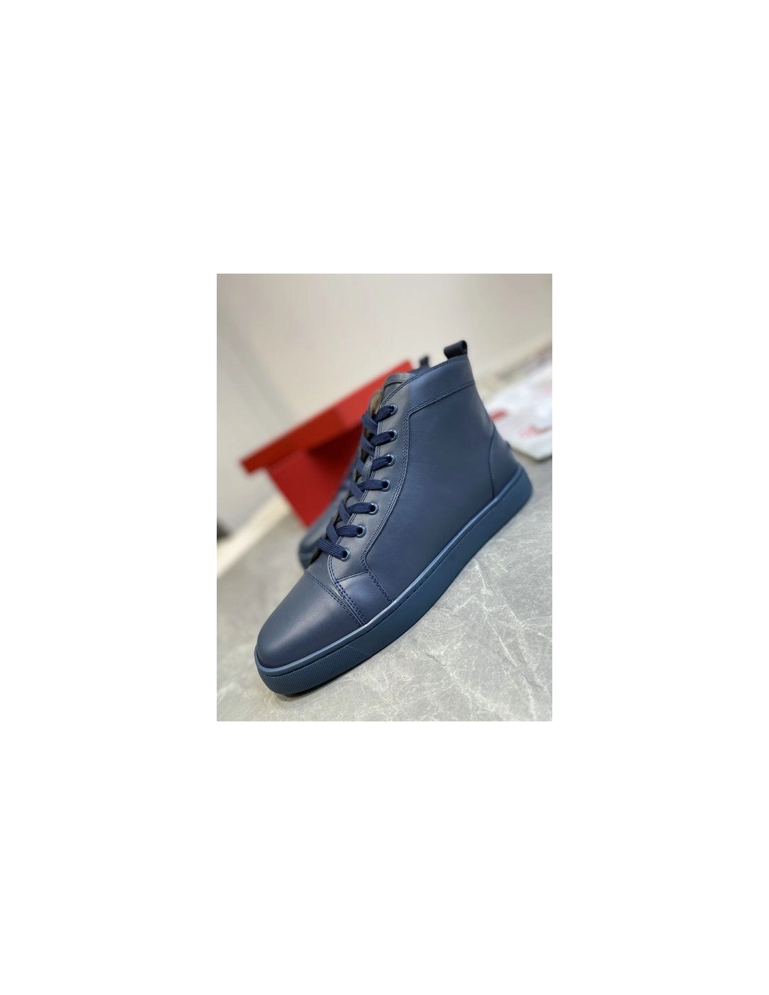 Christian Louboutin Louis High-Top Sneakers Calfskin Navy Blue are an iconic Maison Christian Louboutin model with a sleek silhouette. It is entirely crafted in navy-blue leather, highlighted with topstitching to enhance the different panels. With laces on the upper and a heel tab at the back, this model with a contrasting sole is both elegant and sporty.