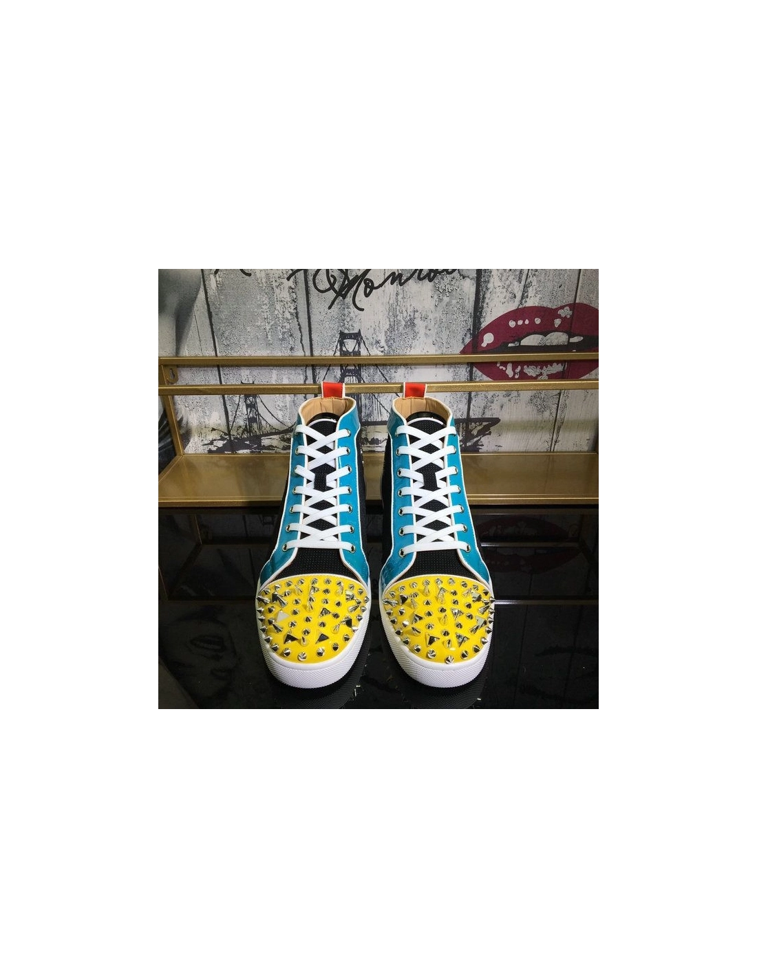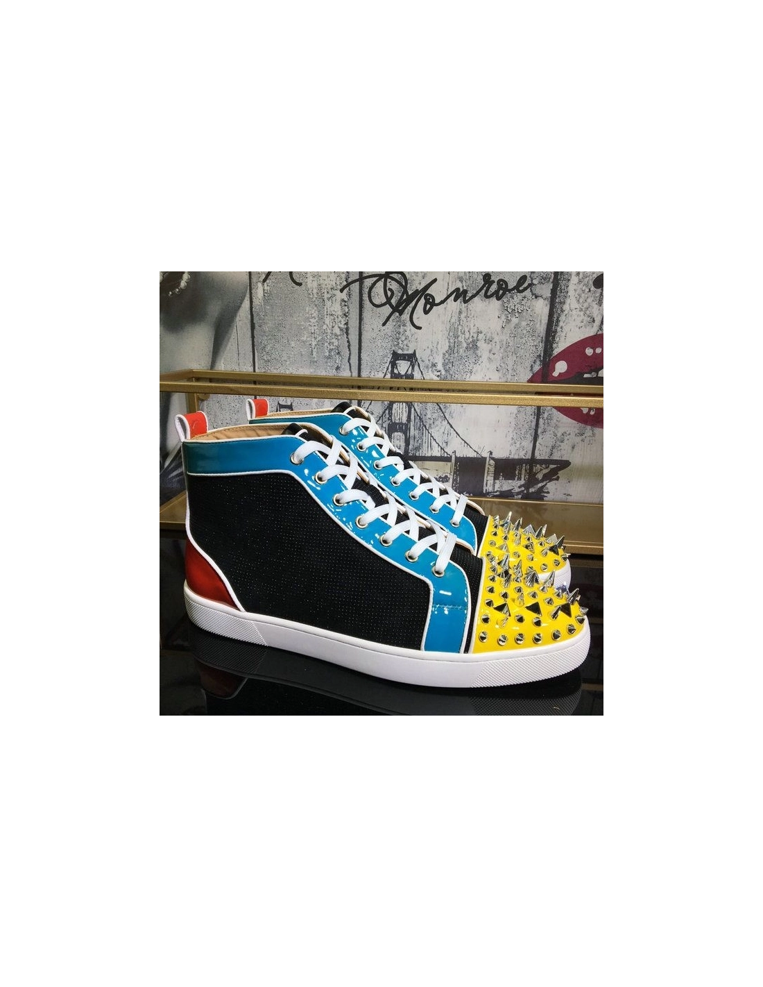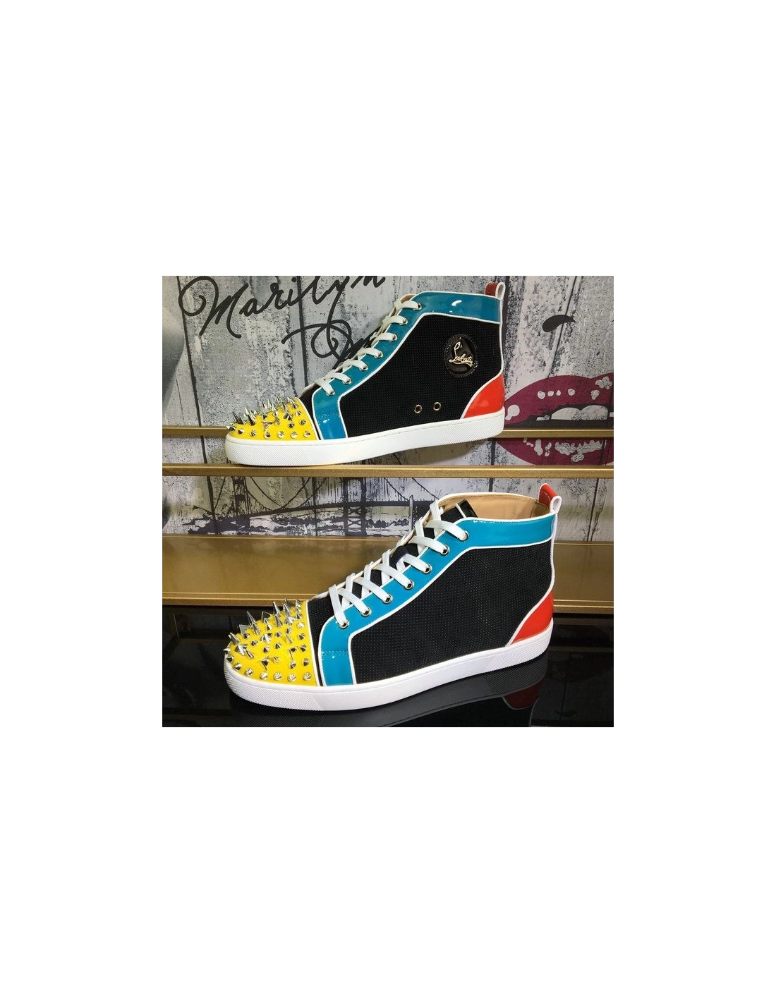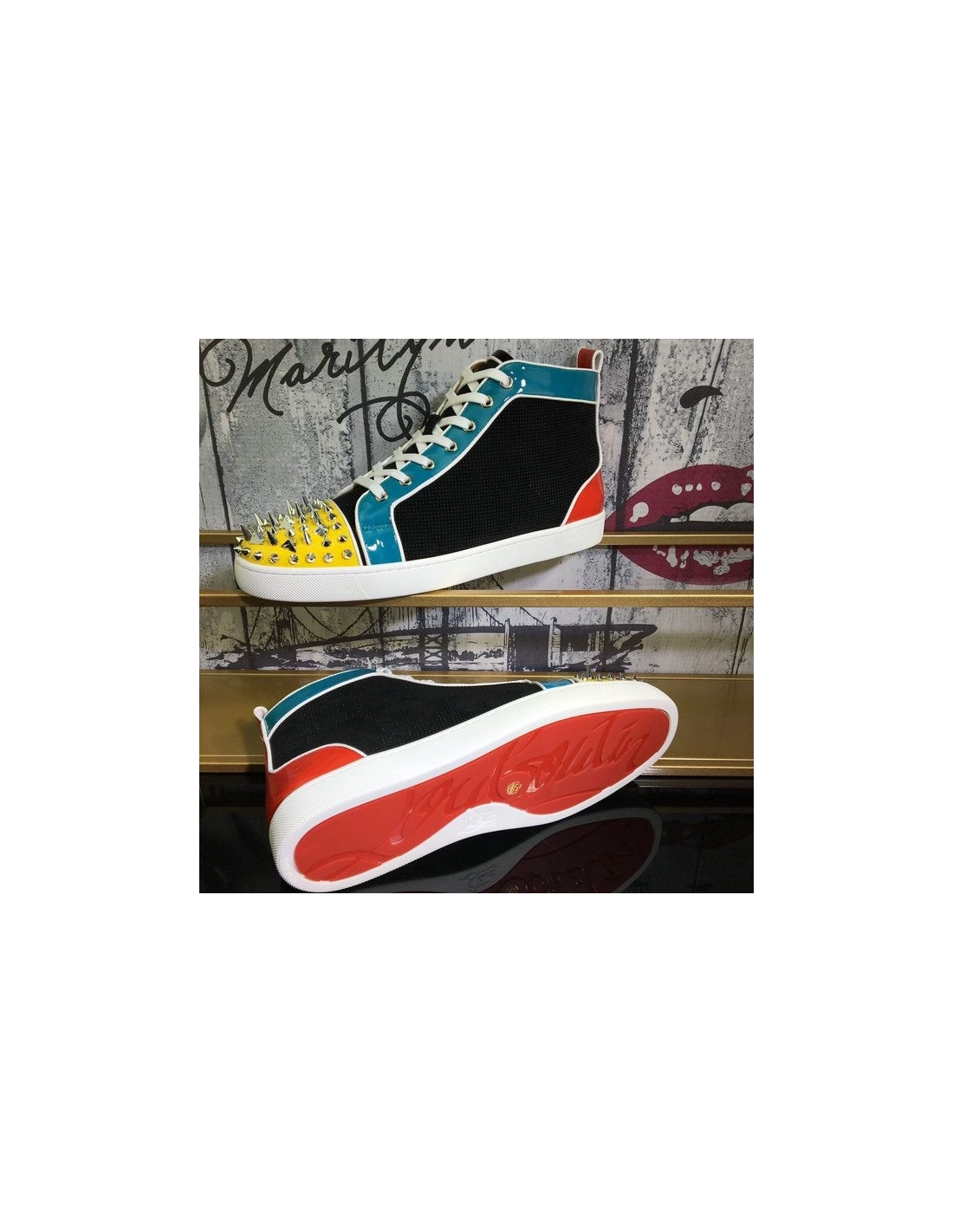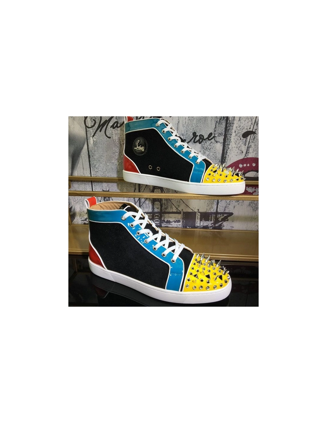 Christian Louboutin Lou Pik Pik Oralto Spiked High-top Sneakers Patent Leather Multi are crafted of various colored patent leather, a fabric tongue and leather toe cap. This is accentuated by prominent various sized silver spikes and studs at the toe. These are superb sneakers with the iconic look of Christian Louboutin!