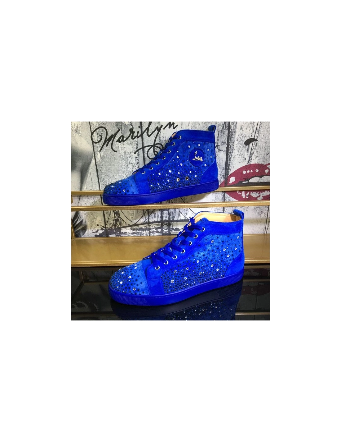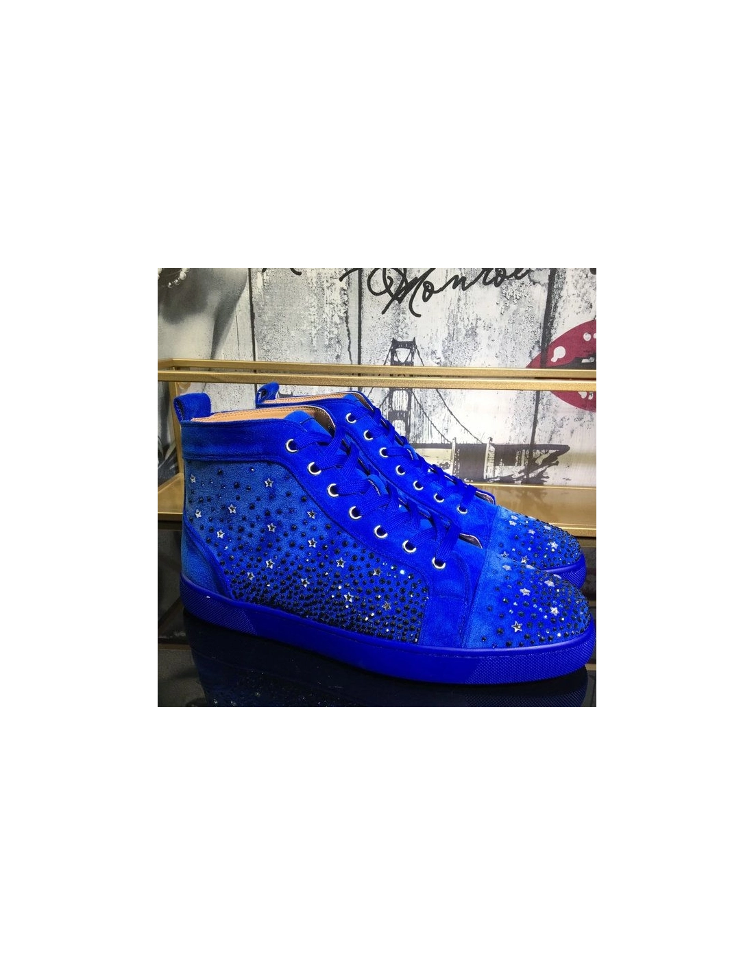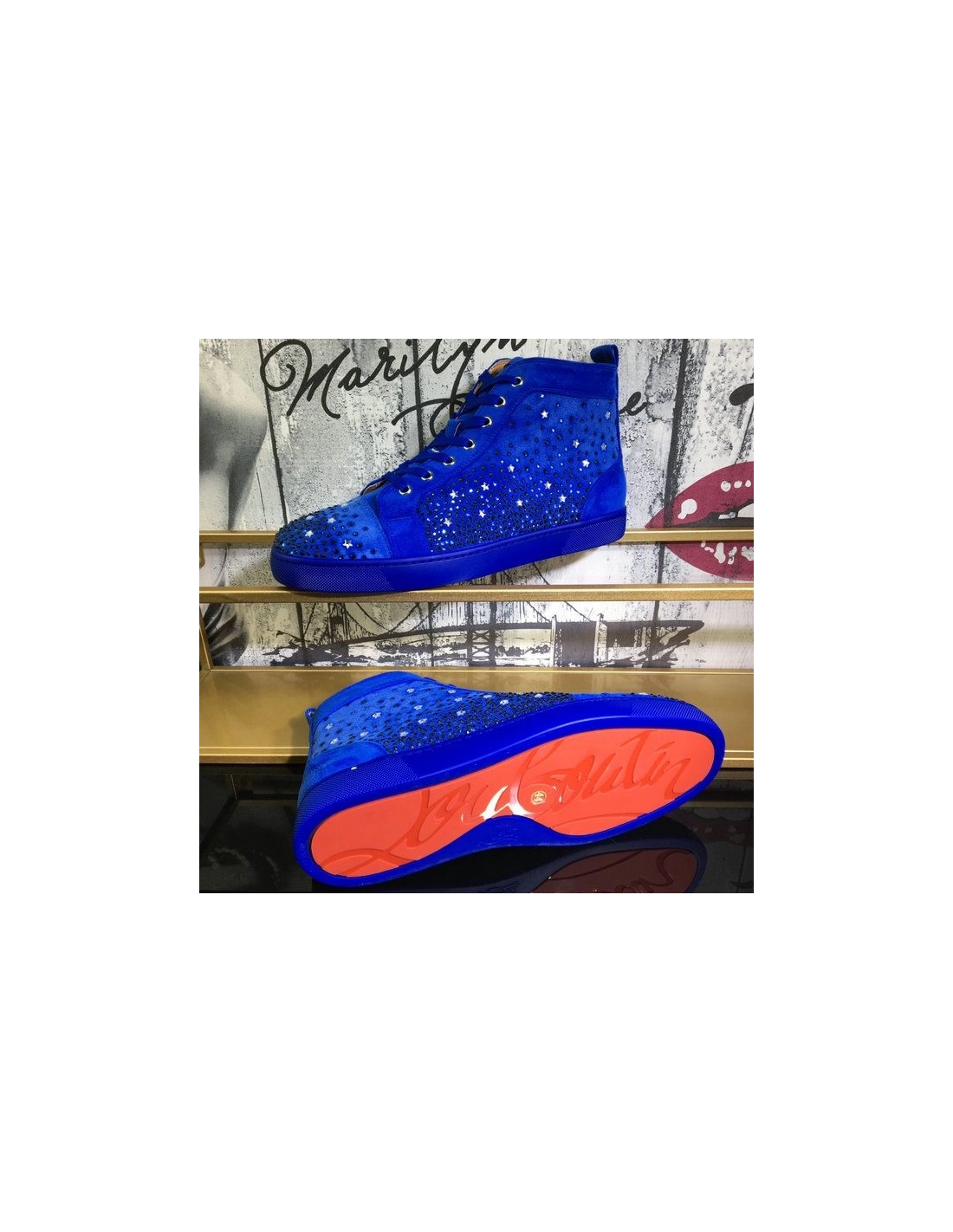 Christian Louboutin Galaxtitude High-top Sneakers Suede Blue have been crafted from red suede and styled with round toes, lace-ups on the vamps, and pull tabs on the counters. The dazzling embellishments on the exterior make them truly eye-catching and they come equipped with comfortable leather insoles and the signature red soles.