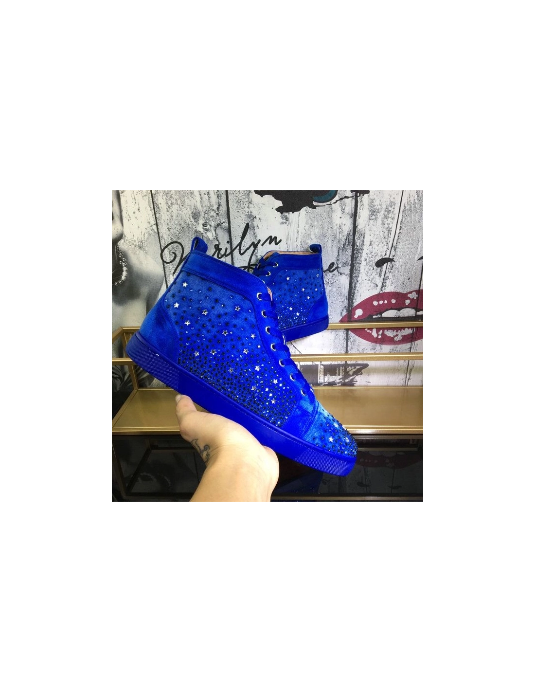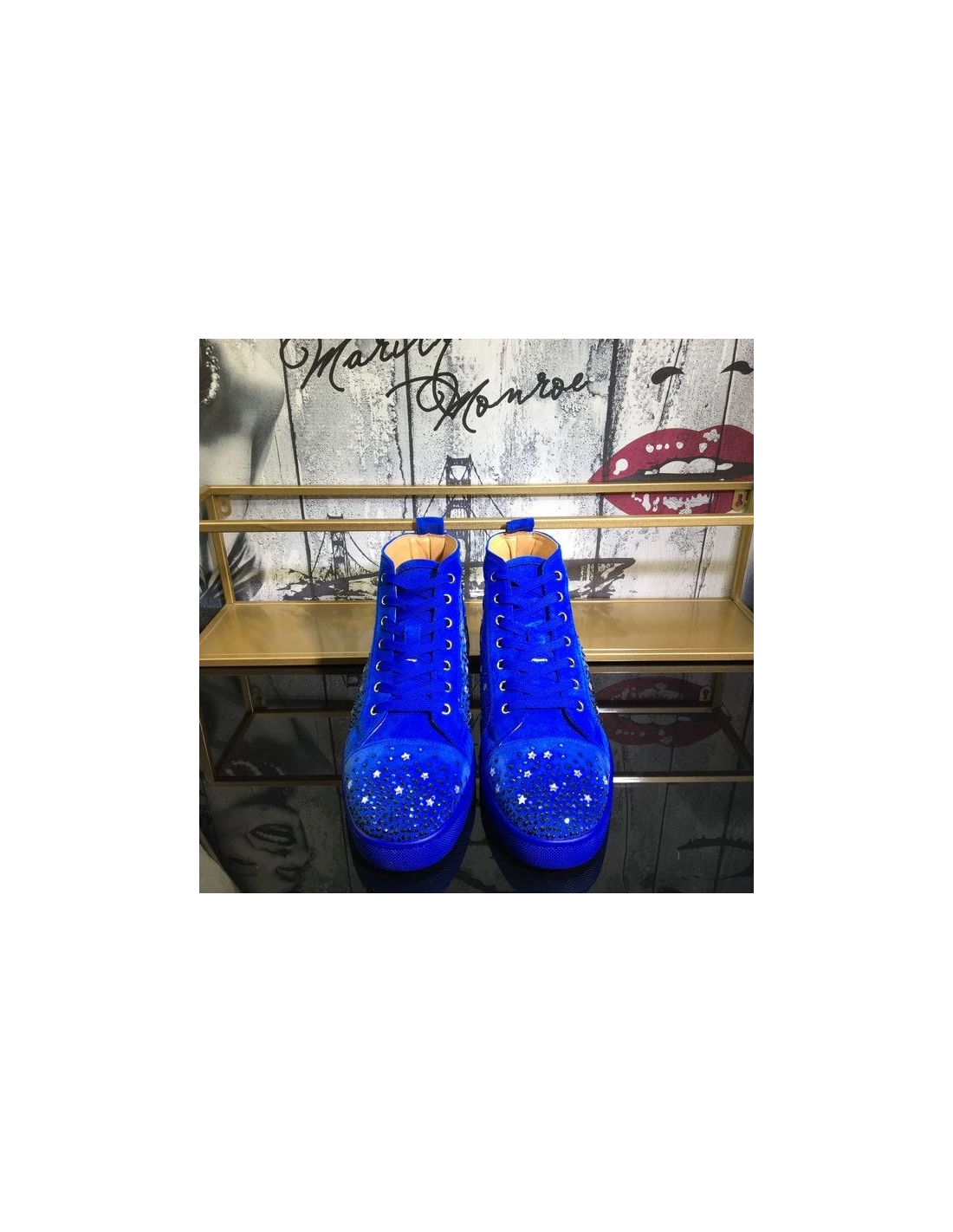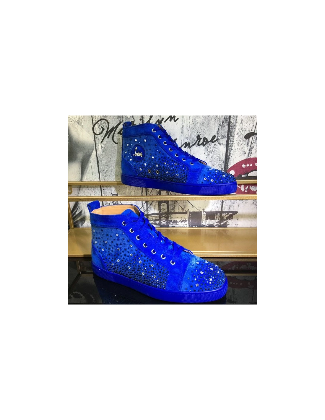 Christian Louboutin Galaxtitude High-top Sneakers Suede Blue have been crafted from red suede and styled with round toes, lace-ups on the vamps, and pull tabs on the counters. The dazzling embellishments on the exterior make them truly eye-catching and they come equipped with comfortable leather insoles and the signature red soles.