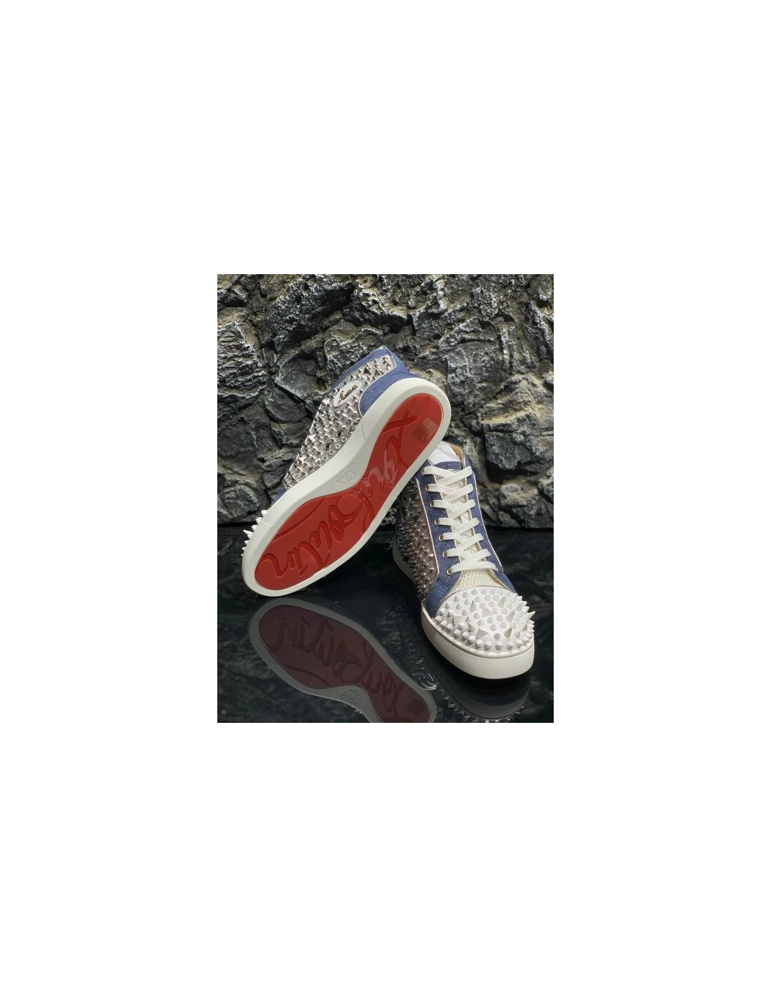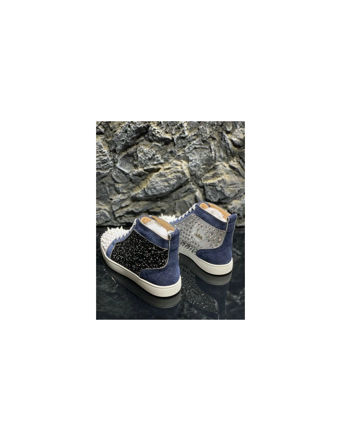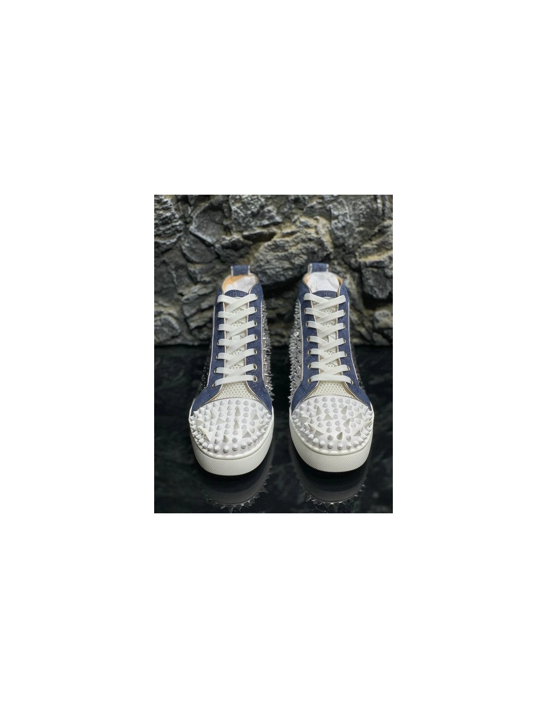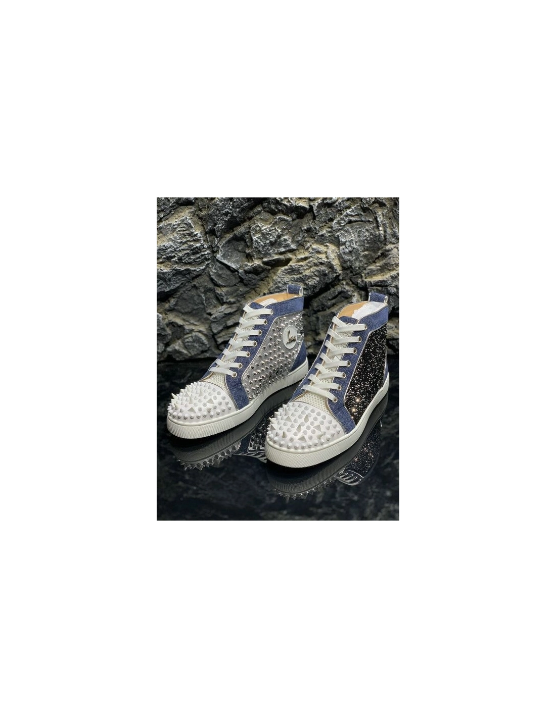 Christian Louboutin Lou Pik Pik High-top Sneakers Denim and Strass Blue White are given an all-over strass treatment. In a play of textures, denim and a contrasting white rubber sole bring a fresh take to this revisited classic Christian Louboutin High-top while the toe cap is embellished with signature spikes.