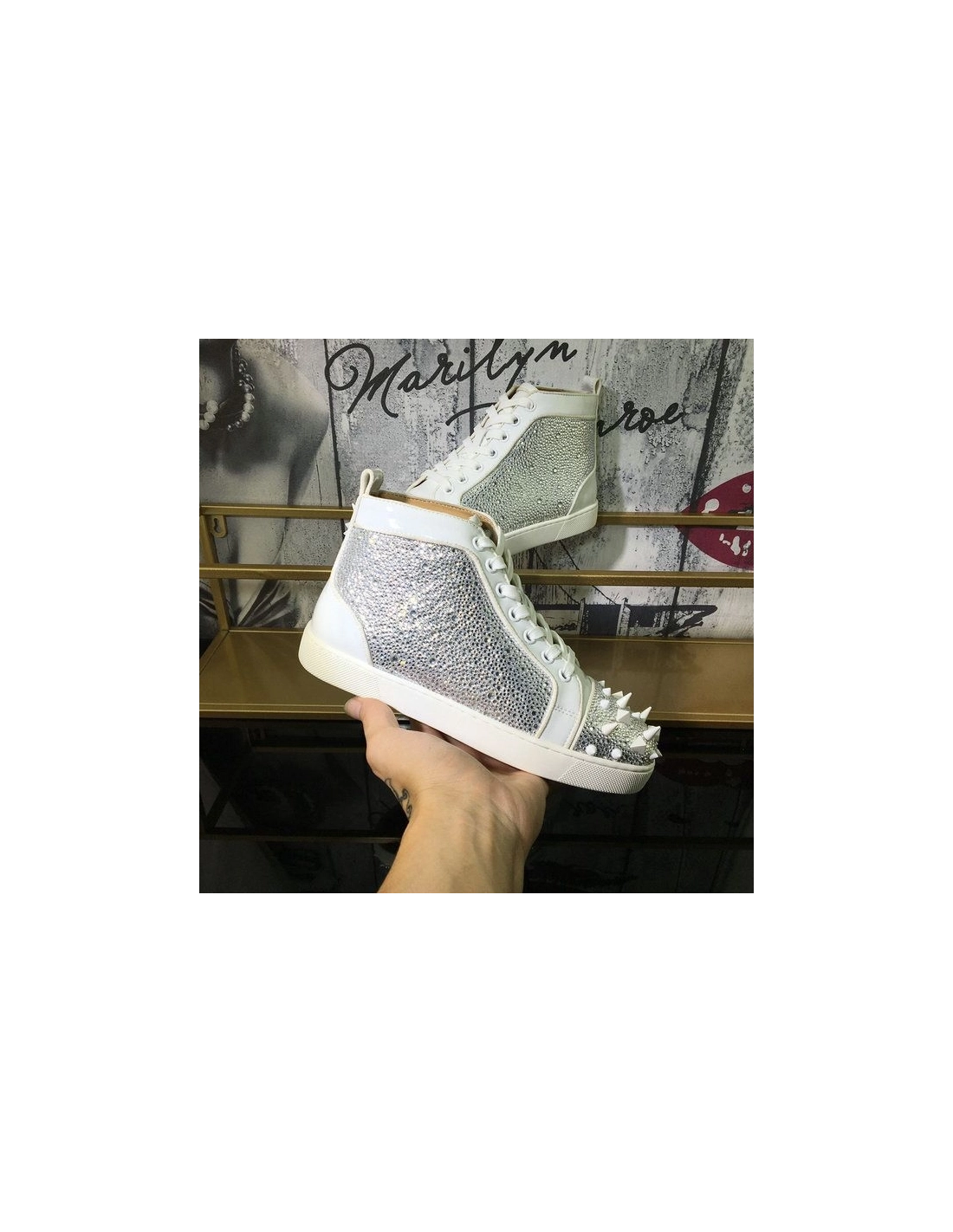 Christian Louboutin Lou Pik Pik Strass High-Top Sneakers Calfskin White place the spotlight on strass and spikes, resulting in a contemporary graphic look. The diamant¨¦-decorated vamp is finished with calf leather inserts on the counter and sides. A creative, beautifully trimmed with delicate finishes and discreet golden topstitching.