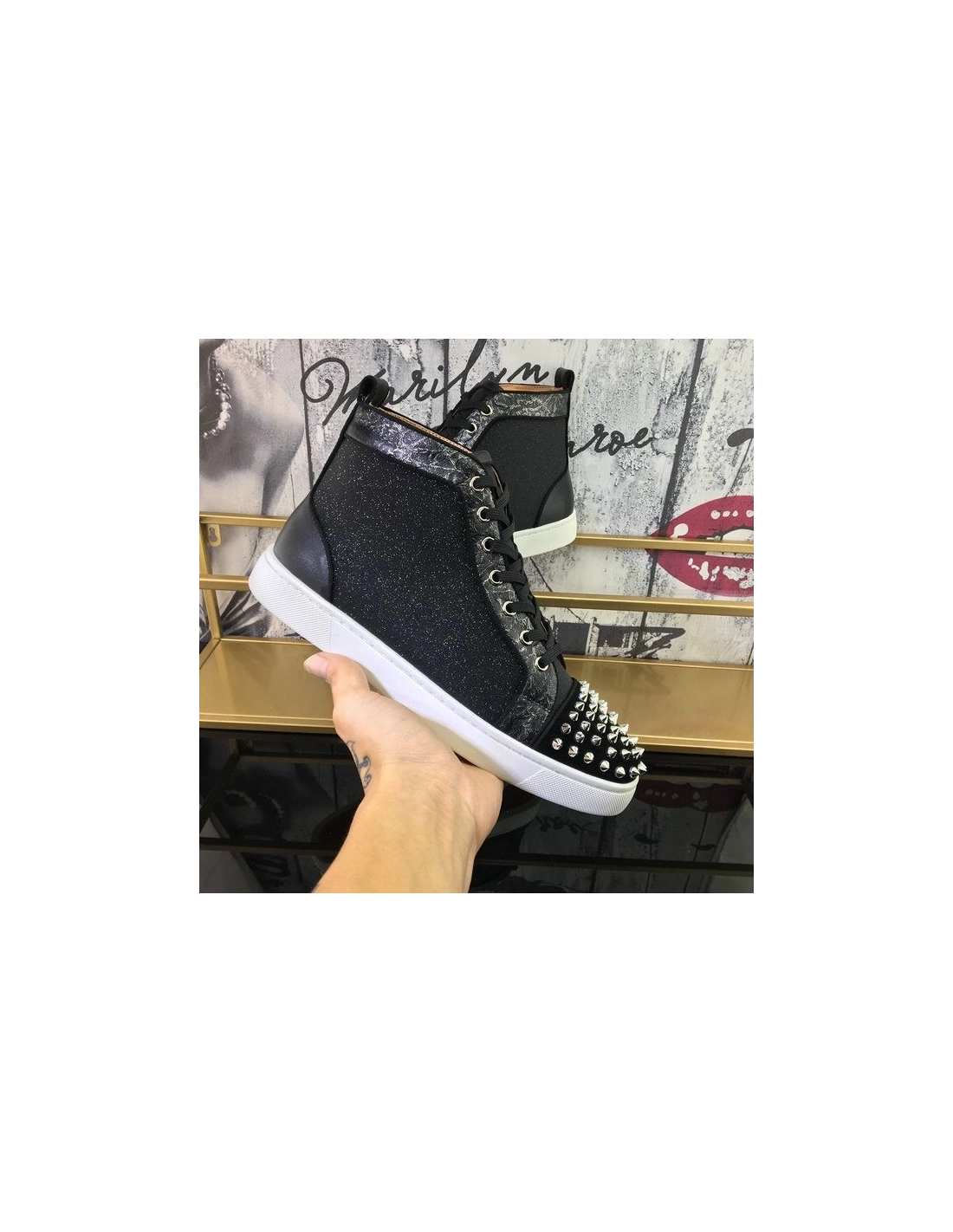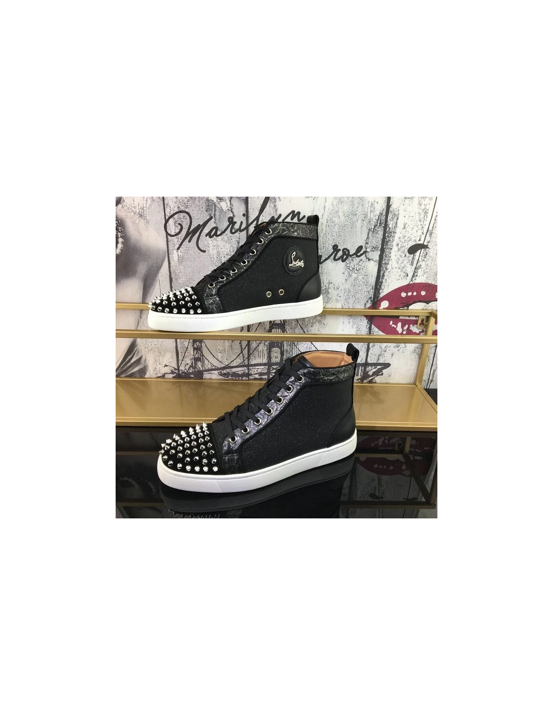 Christian Louboutin Lou Spikes Orlato High-top Sneakers Nubuck And Leather Black White are crafted from black-silver Nubuck leather and leather into a high-top silhouette. They showcase lace-up fastenings and silver-tone hardware on the vamps. Add these trendy sneakers to your collection now.