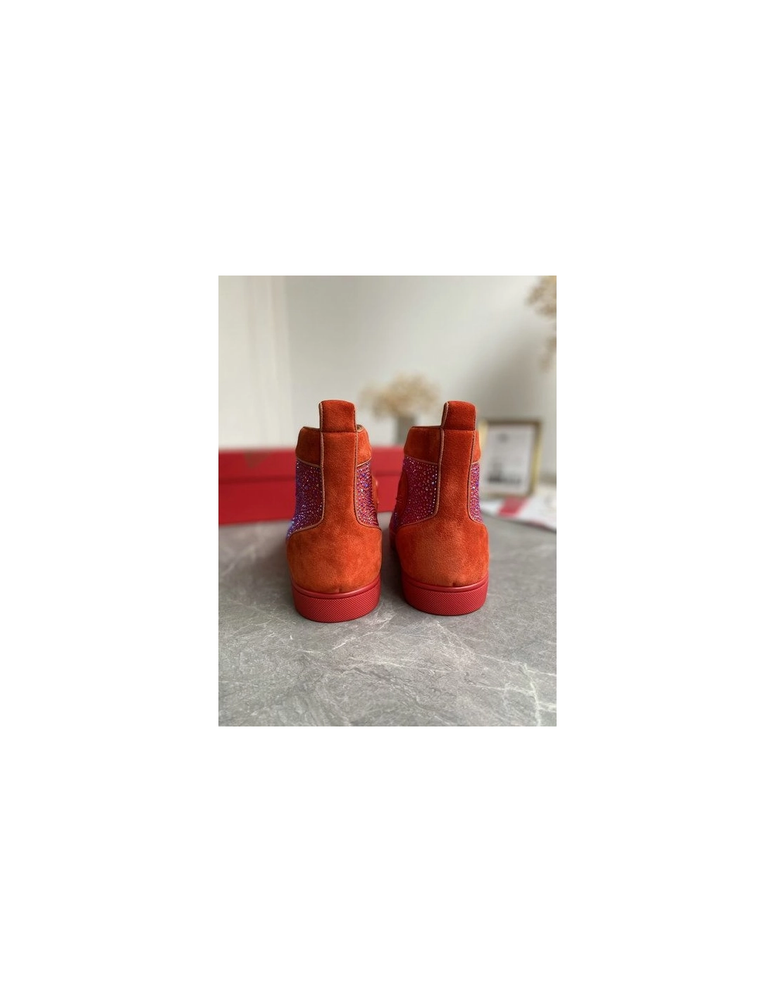 Christian Louboutin Louis Strass High-Top Sneakers Veau Velous and Strass Orange are inspired by the basketball sneakers of the 1980s with classic lines and a retro-feel. Each season this cult-like style is dressed in new materials and colours, from timeless offerings to daring modern looks. This model is embellished with a myriad of sparkling strass that catch the light.