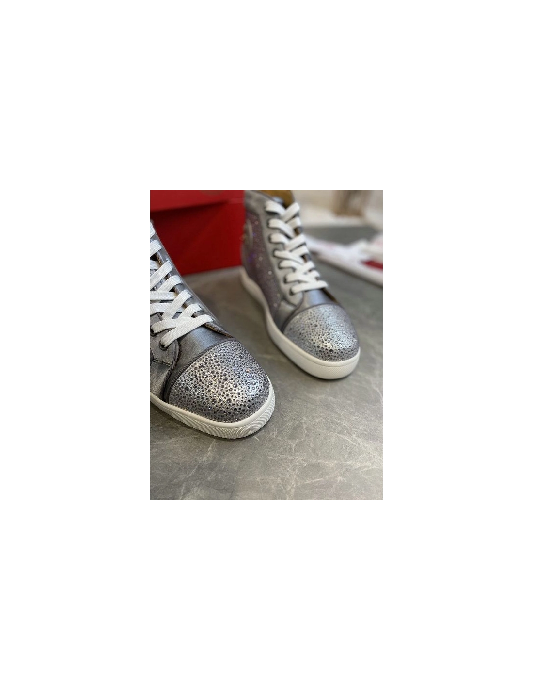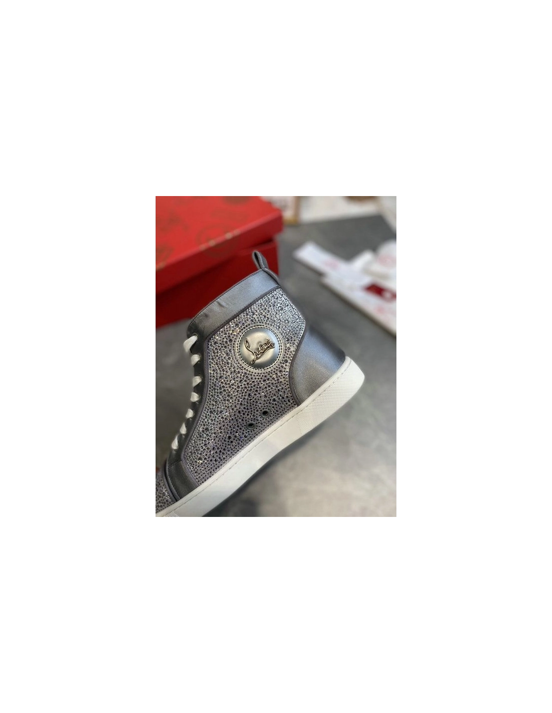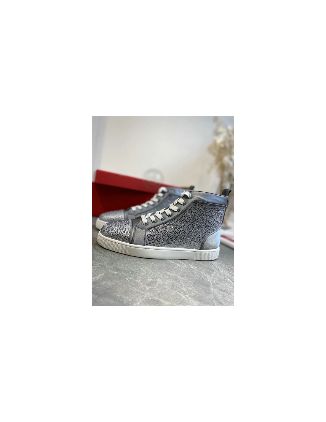 Christian Louboutin Louis Strass High-Top Sneakers Leather and Strass Gray are inspired by the basketball sneakers of the 1980s with classic lines and a retro-feel. Each season this cult-like style is dressed in new materials and colours, from timeless offerings to daring modern looks. This model is embellished with a myriad of sparkling strass that catch the light.