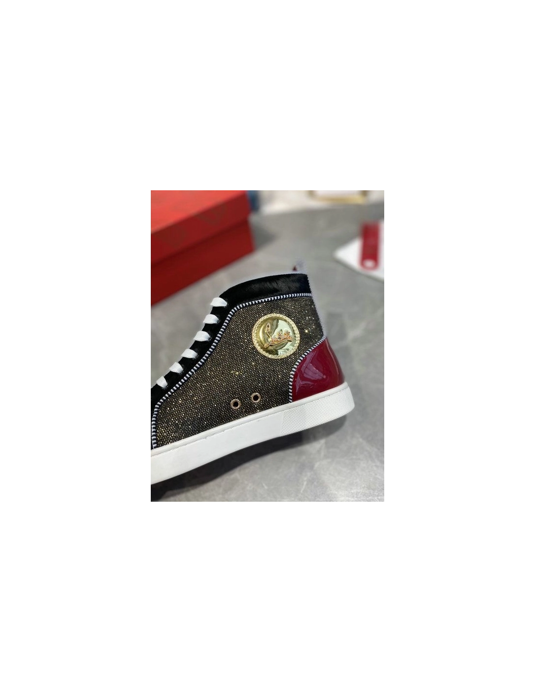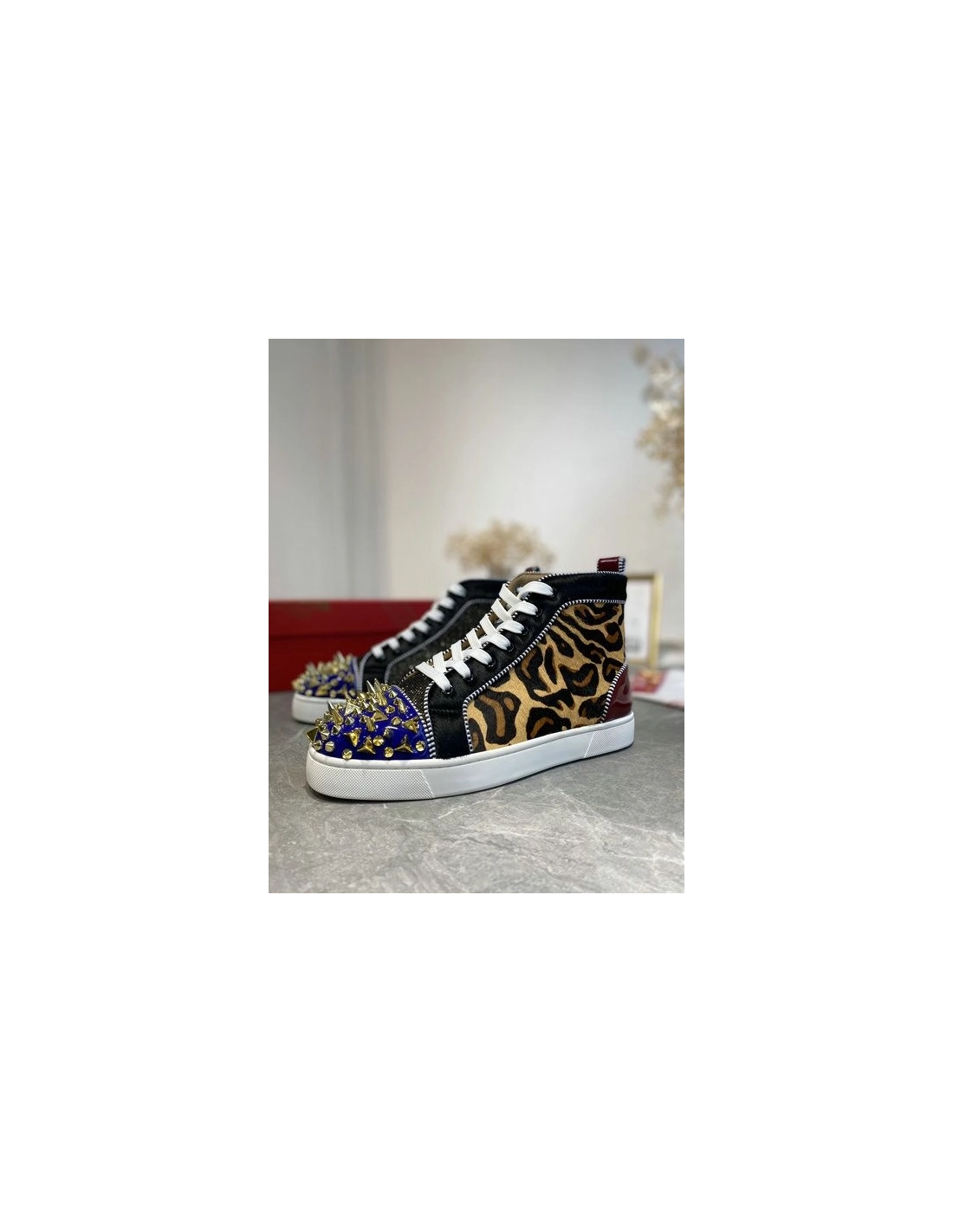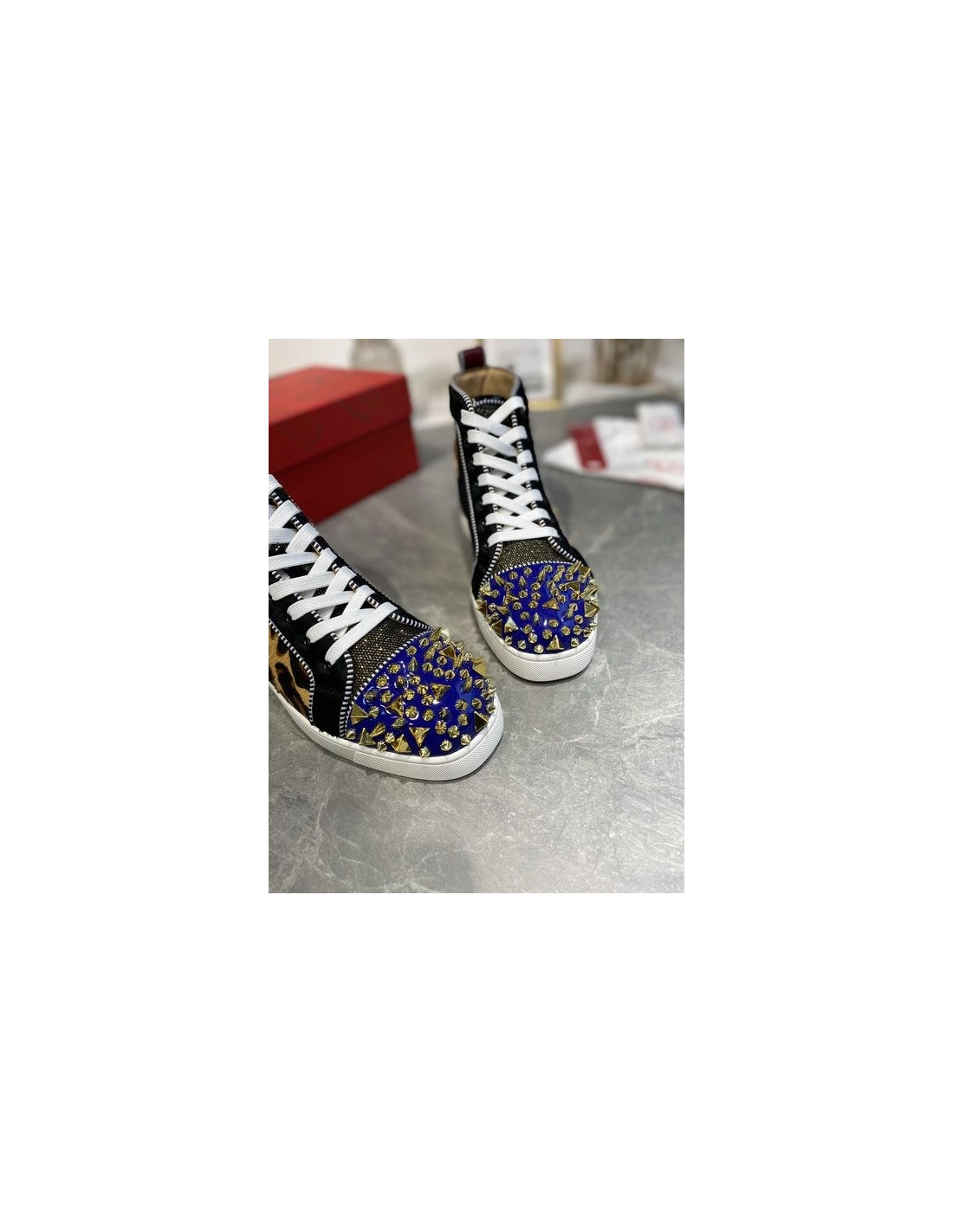 Christian Louboutin Louis Pik Pik Spikes High-top Sneakers Veau Velours and Patent Leather Multicolorinspired by the classic 1980s basketball sneakers. This season the iconic high-top exudes edgy elegance with a red patent eyestay. A dolly mixture of spiky Pik Pik spikes adorn the toe box for edgy attitude.