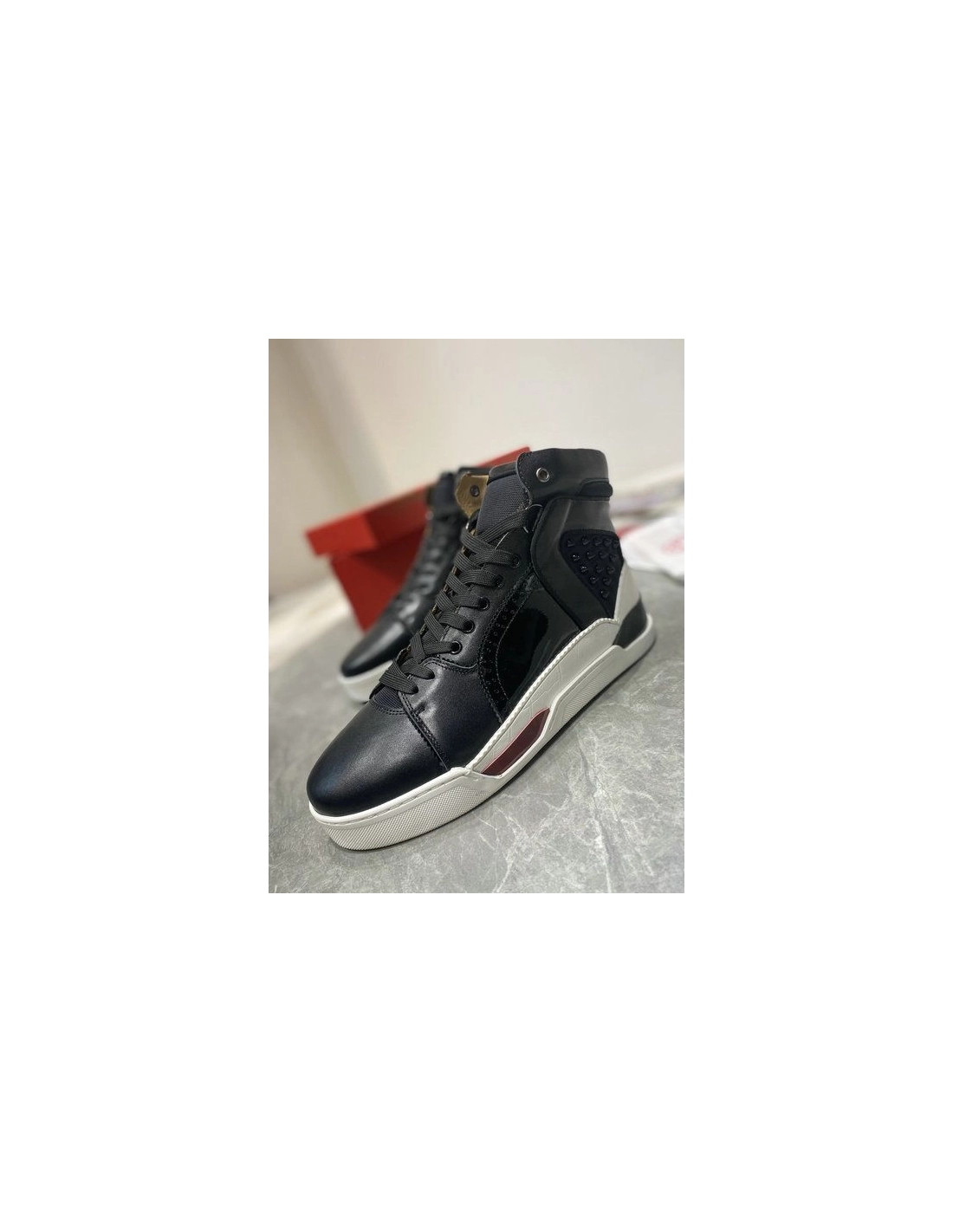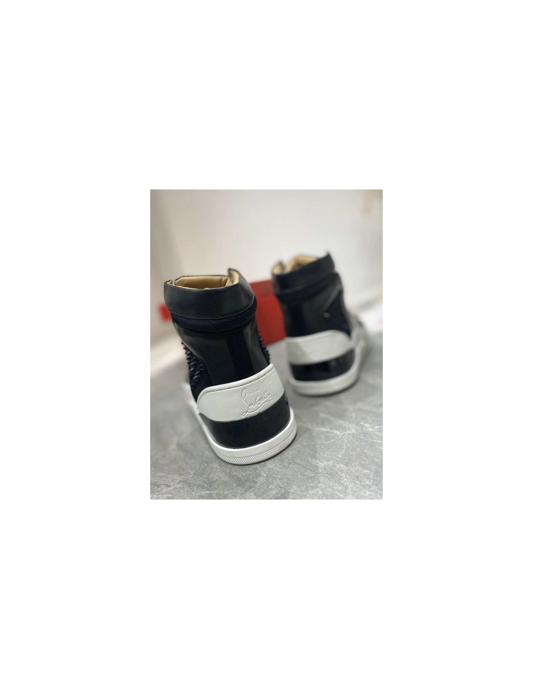 Christian Louboutin Loubikick High Top Sneakers Calf Leather Blacktake its inspiration straight from the basketball court. Christian Louboutin High-top Loubikick featuring technical mouldings on the outsole and spikes encrusted panels, it mixes easy elegance with an urban inflection for a fresh contemporary twist on the classic evening shoe.