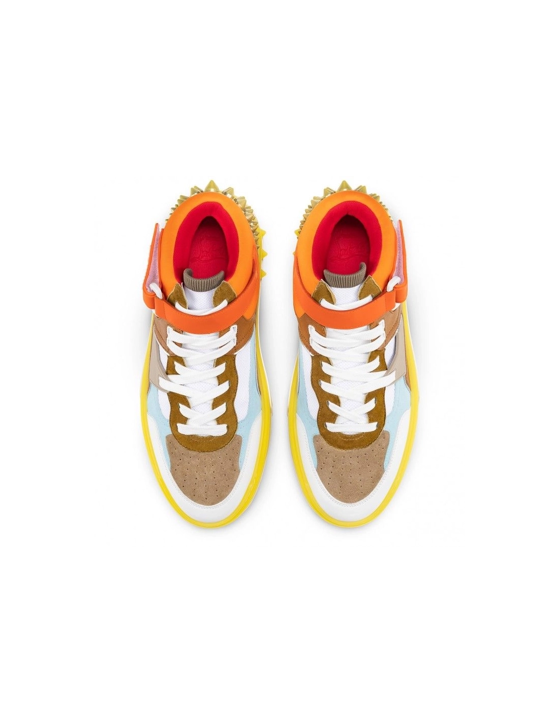 Cheap Christian Louboutin Astroloubi Mid High-Top Sneakers Multicolor on Sale sits on a two-color rubber sole. Combining a variety of colors and textures, this model has a hook and loop strap at the side. It also features a CL monogram on the side and gold signature Maison Christian Louboutin spikes at the back.