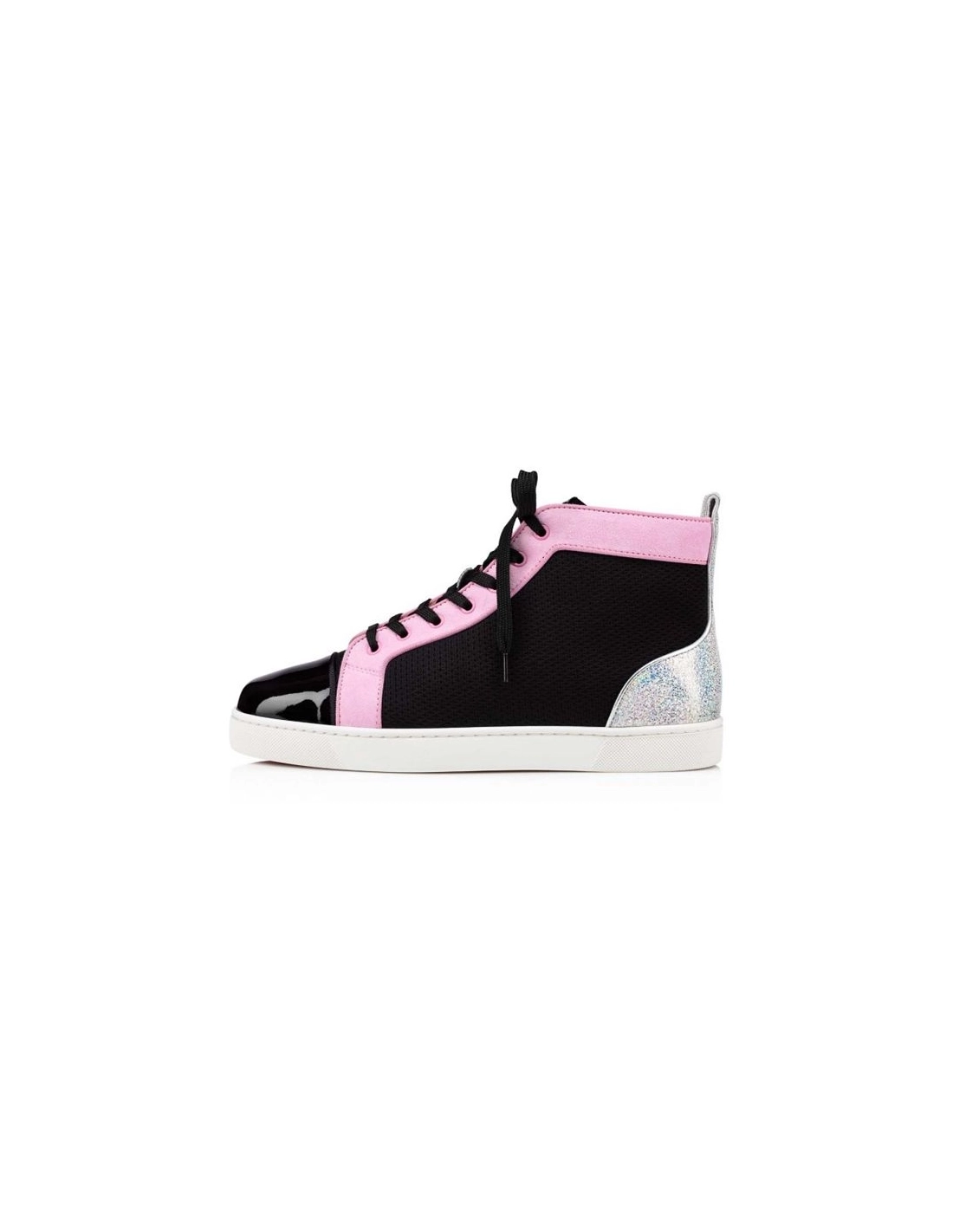 The Louis Orlato is an iconic sneaker inspired by basketball shoes from the 1980s. This season the classic Christian Louboutin High Top Louis Orlato Version Multi Patent Calf in black Mesh Stocking, complimented by Confettis pink veau velours on the eyestay, a black patent toe box and glittery silver-tone Nappa Mica on the heel counter. As with all Louis Orlato, a tonal grosgrain trim perfectly frames the construction.Color :VERSION MULTIMaterial :Patent calfCollection : Summer 22