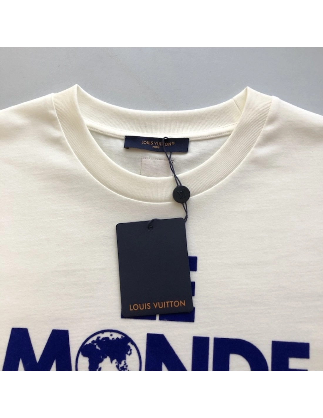 This white cotton t-shirt is embellished with a graphic printed slogan from the Spring-Summer 2025 show, with the words 'Le Monde Est ? Vous' in vibrant blue across the chest. A printed LV adorns the bottom right, while a Marque L.Vuitton D¨¦pos¨¦e label signs the center back. This crisp design brings a fresh accent to casual looks.