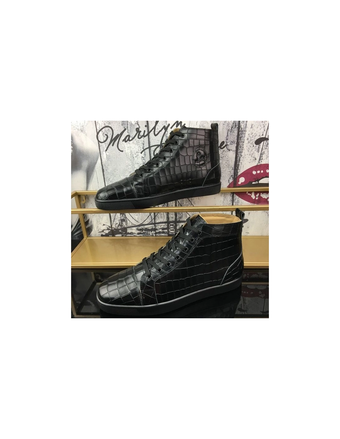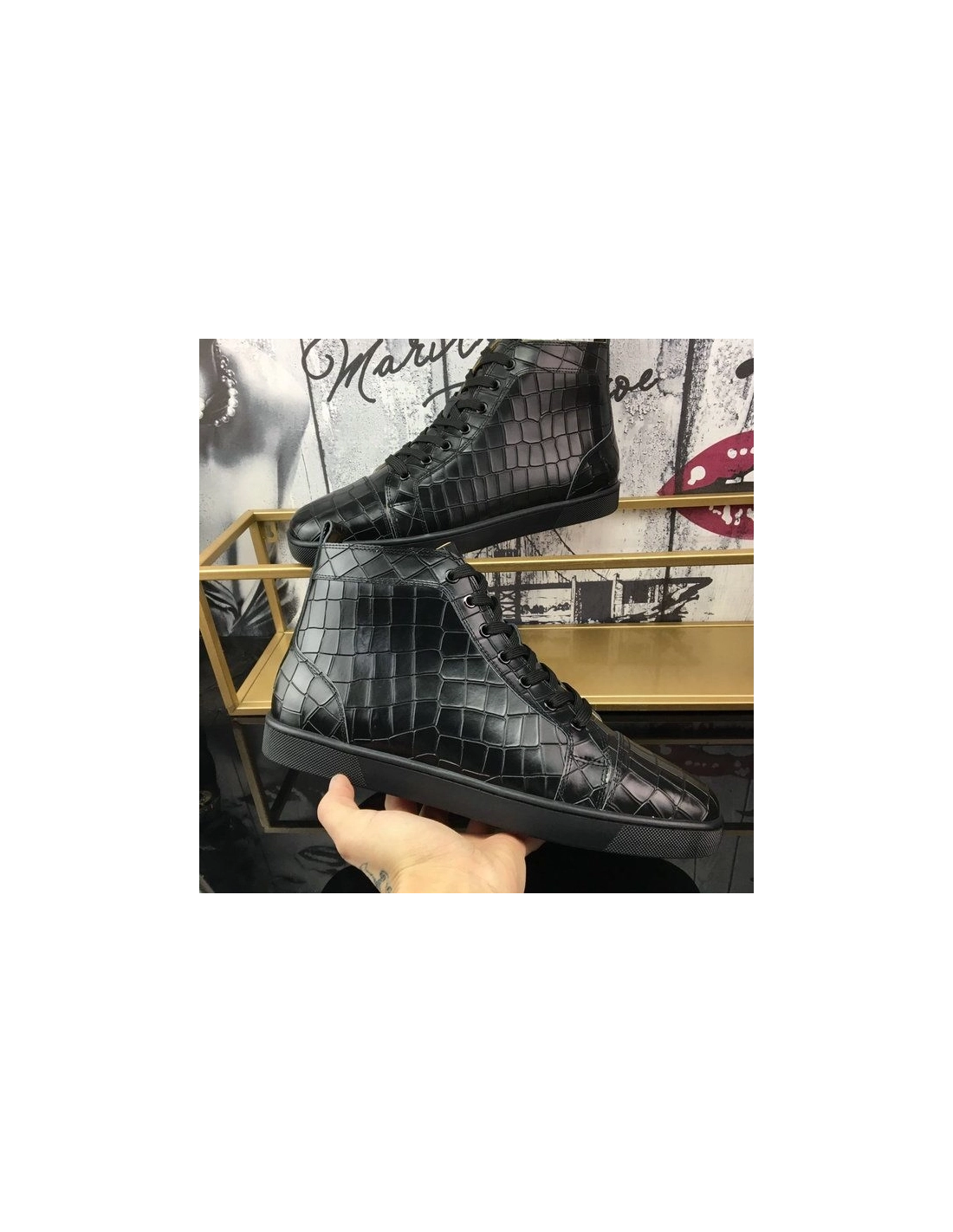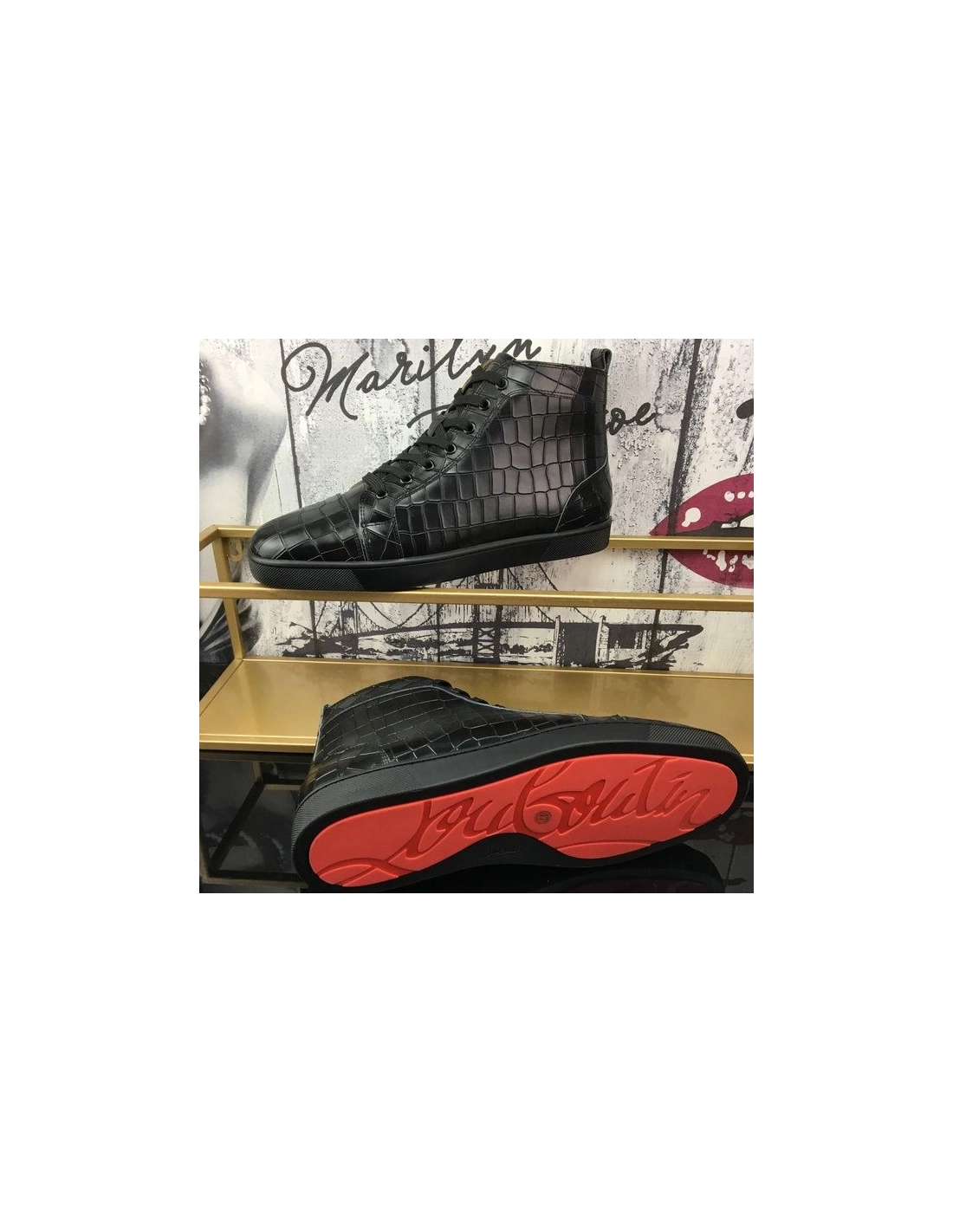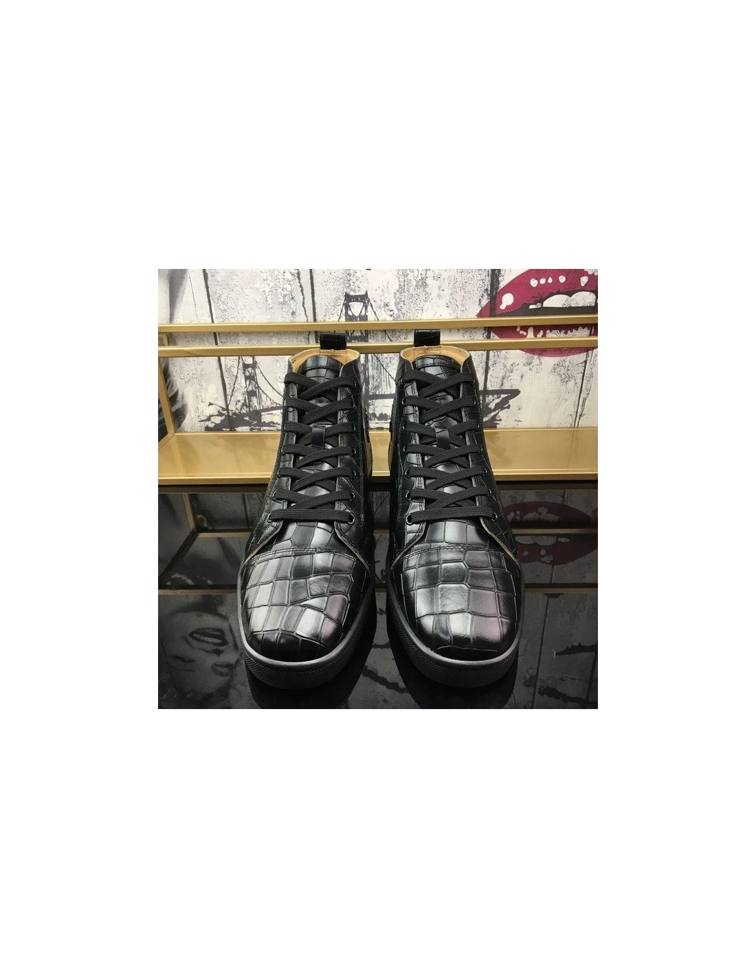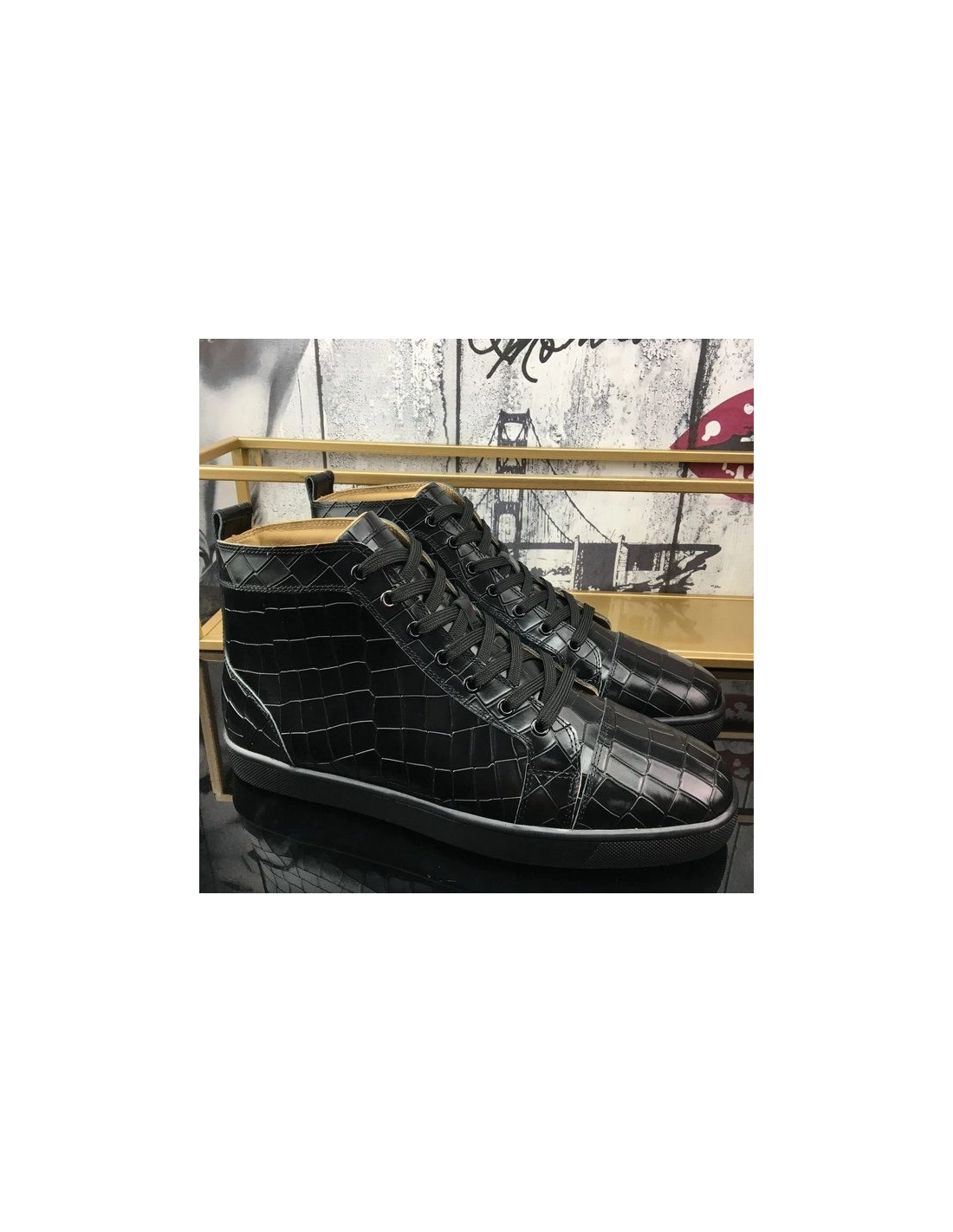 Christian Louboutin Louis Flat High-Top Sneakers Crocodile Embossed Leather Black