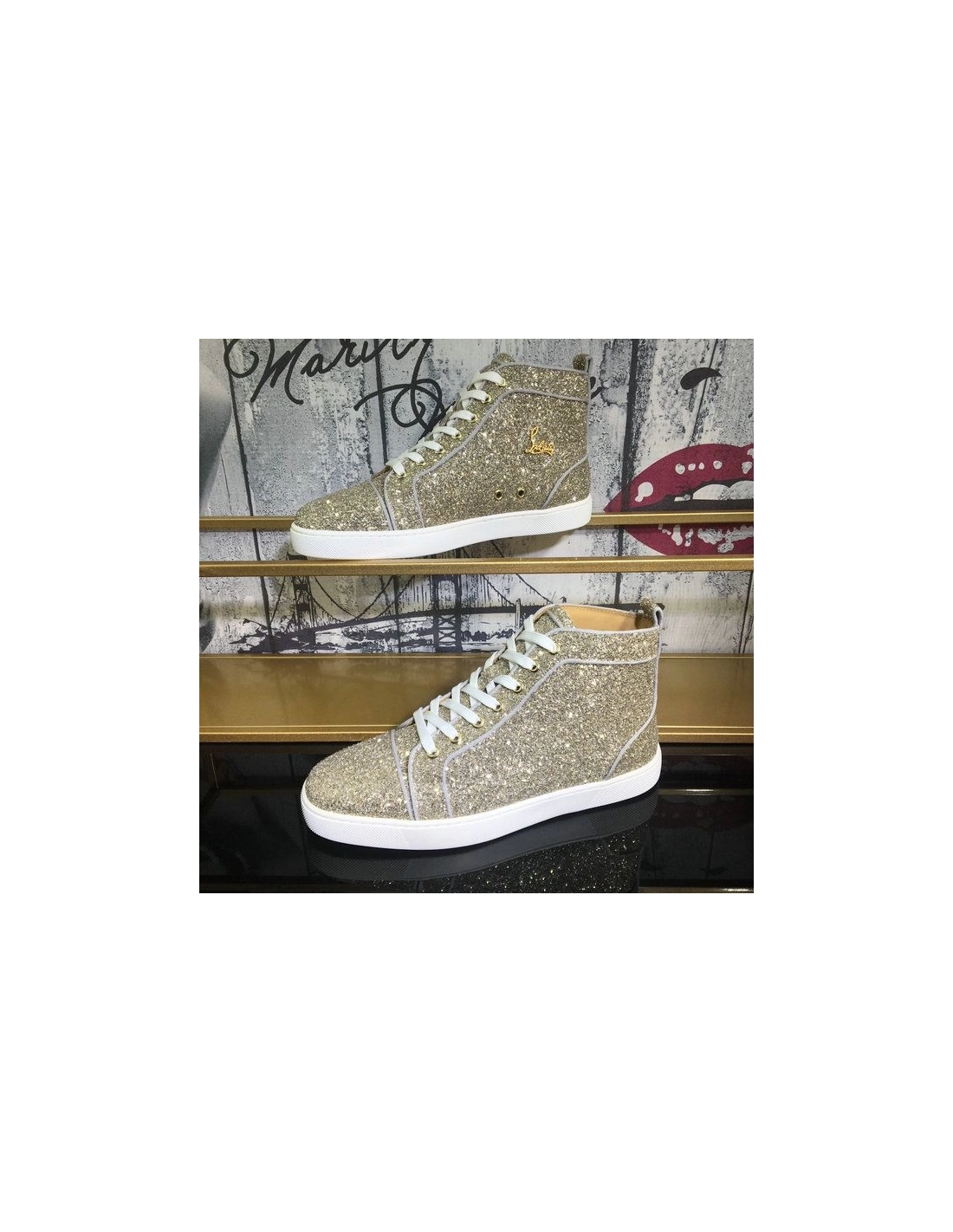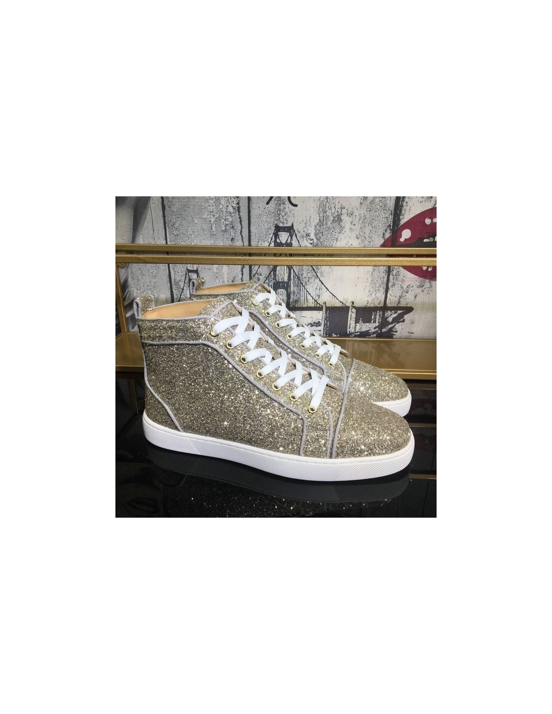 Christian Louboutin Louis Orlato Flat High-Top Sneakers Glitter Fabric Gold