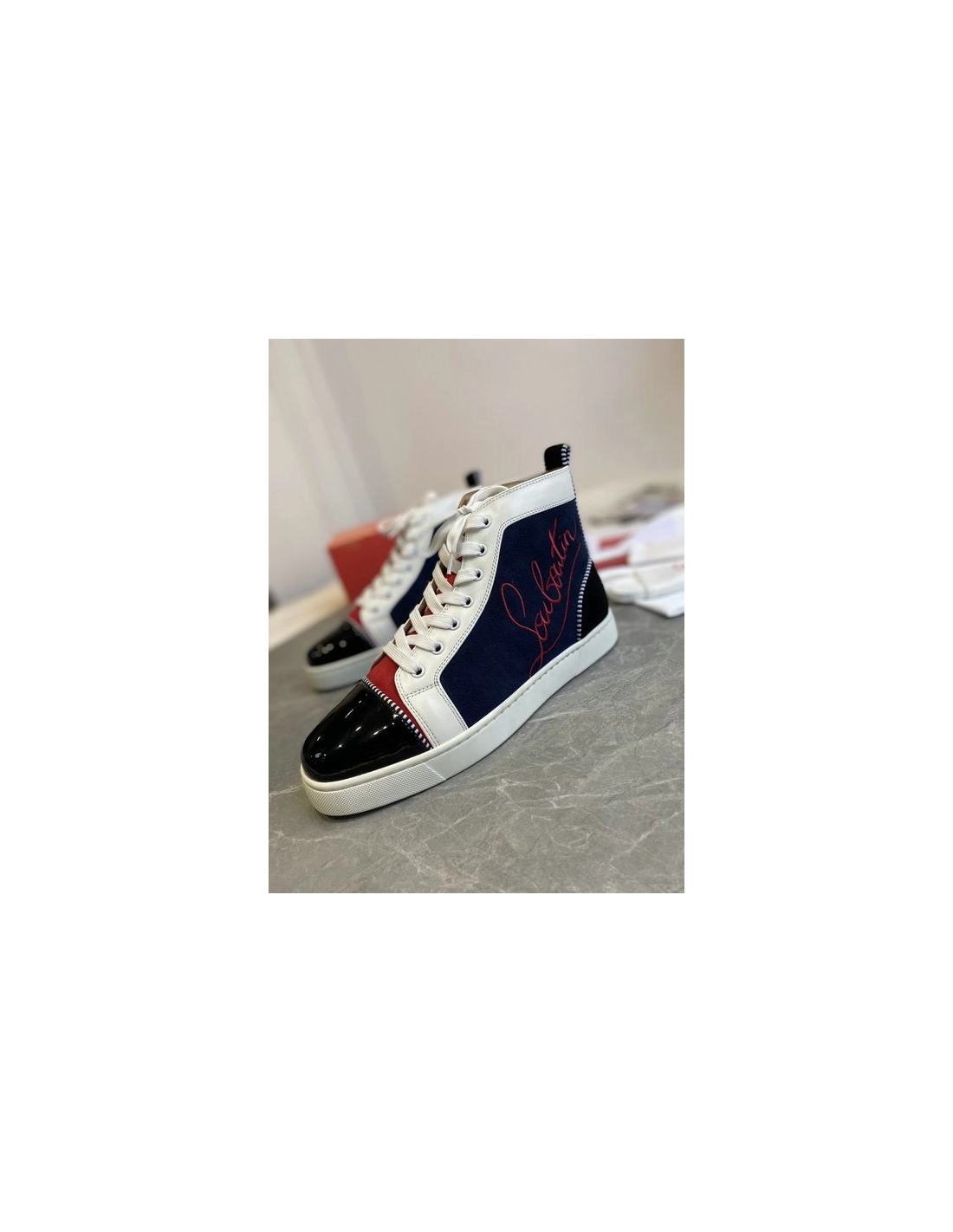 Christian Louboutin Louis Flat High-Top Sneakers Patent Suede Leather Blue Black