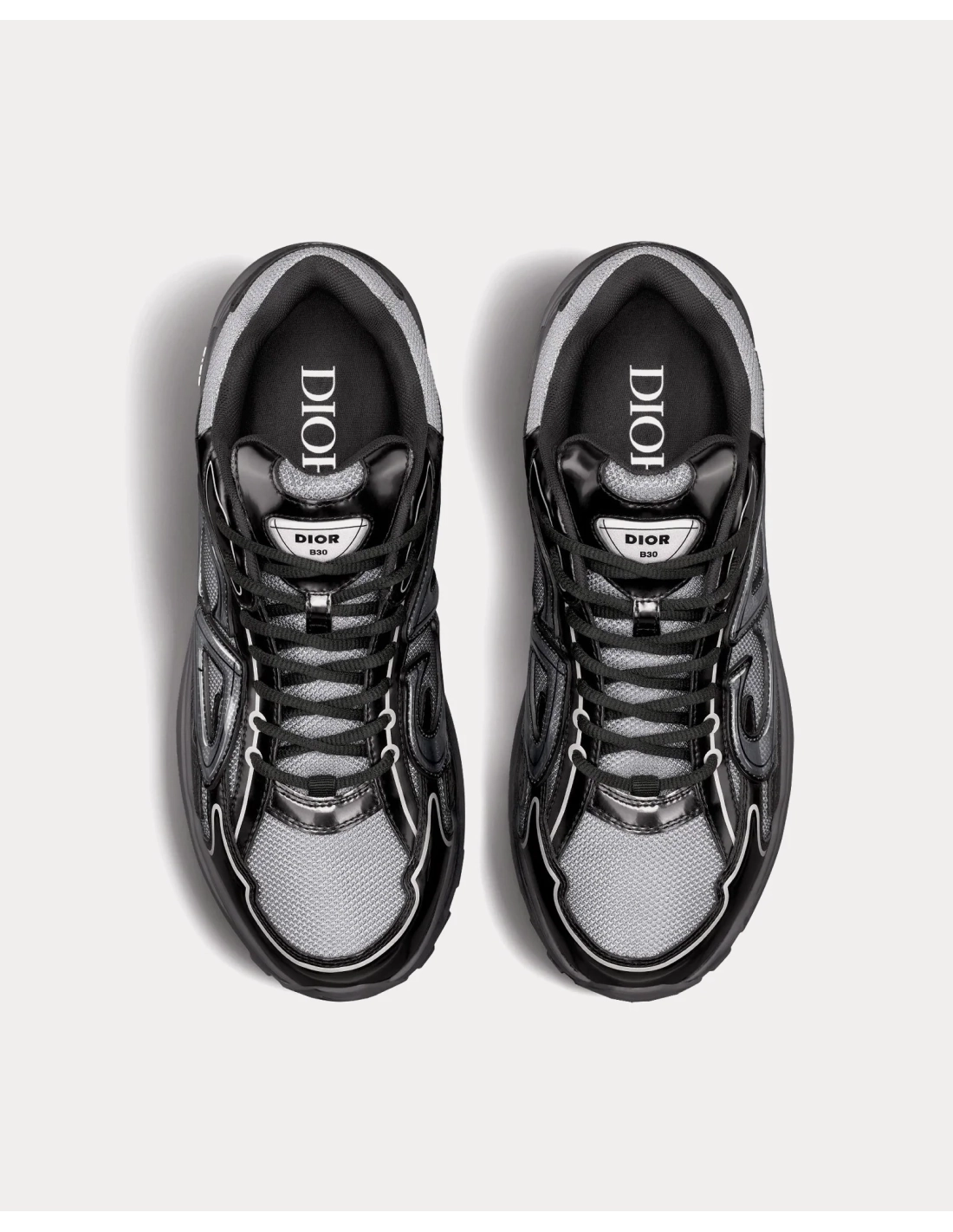 The men's dior b30 low top sneakers in Light Gray Technical Mesh and Black Brilliant-Finish Technical Fabric are crafted from mesh and technical fabric and feature Dior B30 signature tongue, lace-up closure, calfskin and technical mesh lining, ultra-lightweight sculpted rubber outsole with Dior signature edging, two-tone sole with Dior, B30 and CD30 signature, and a welded construction.