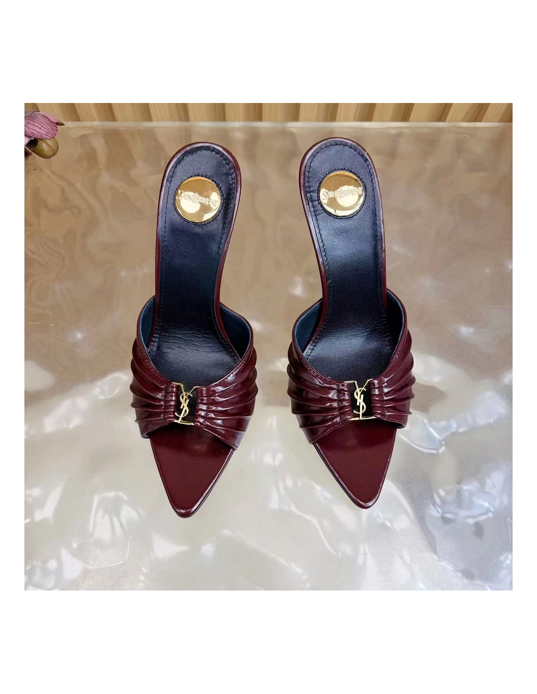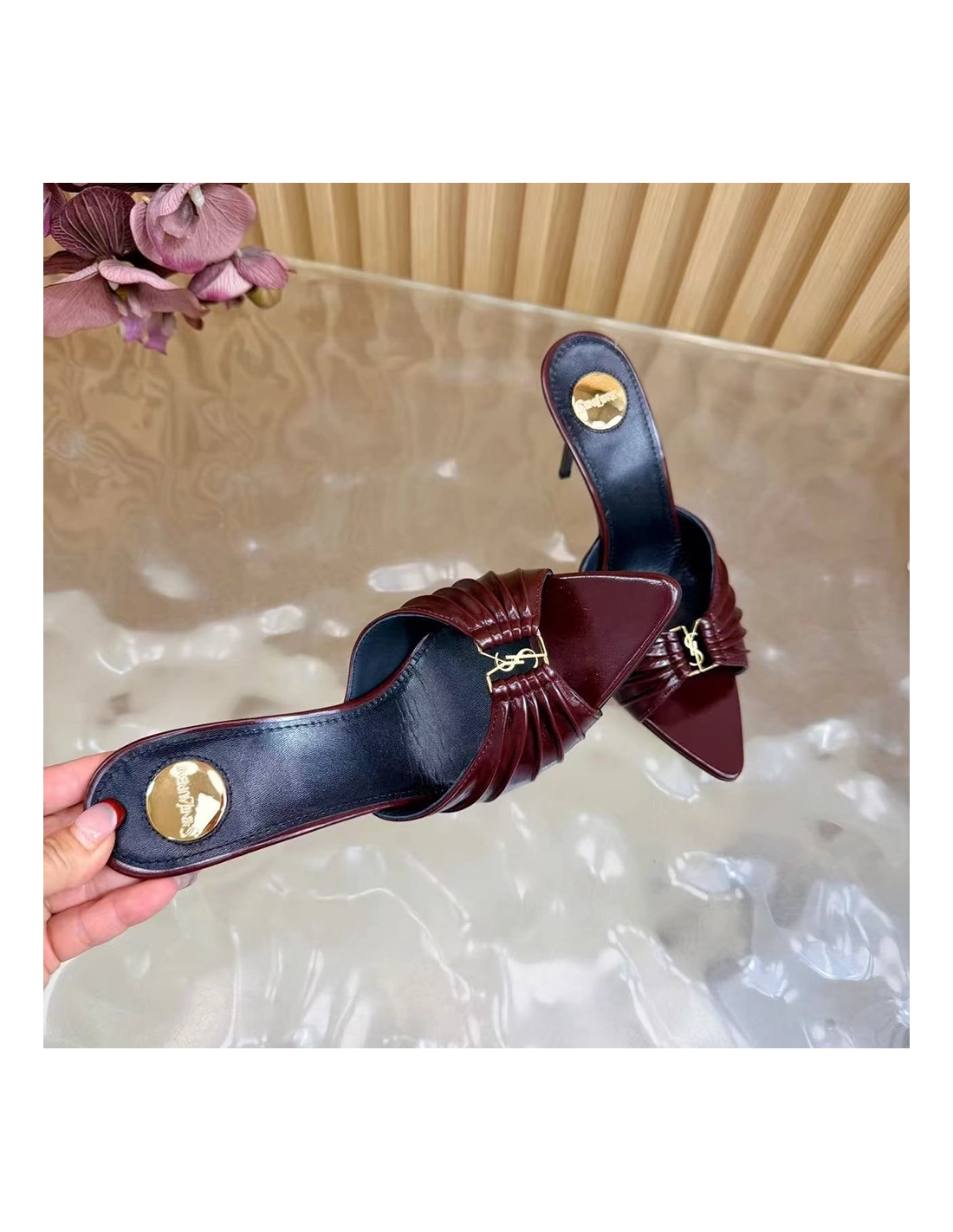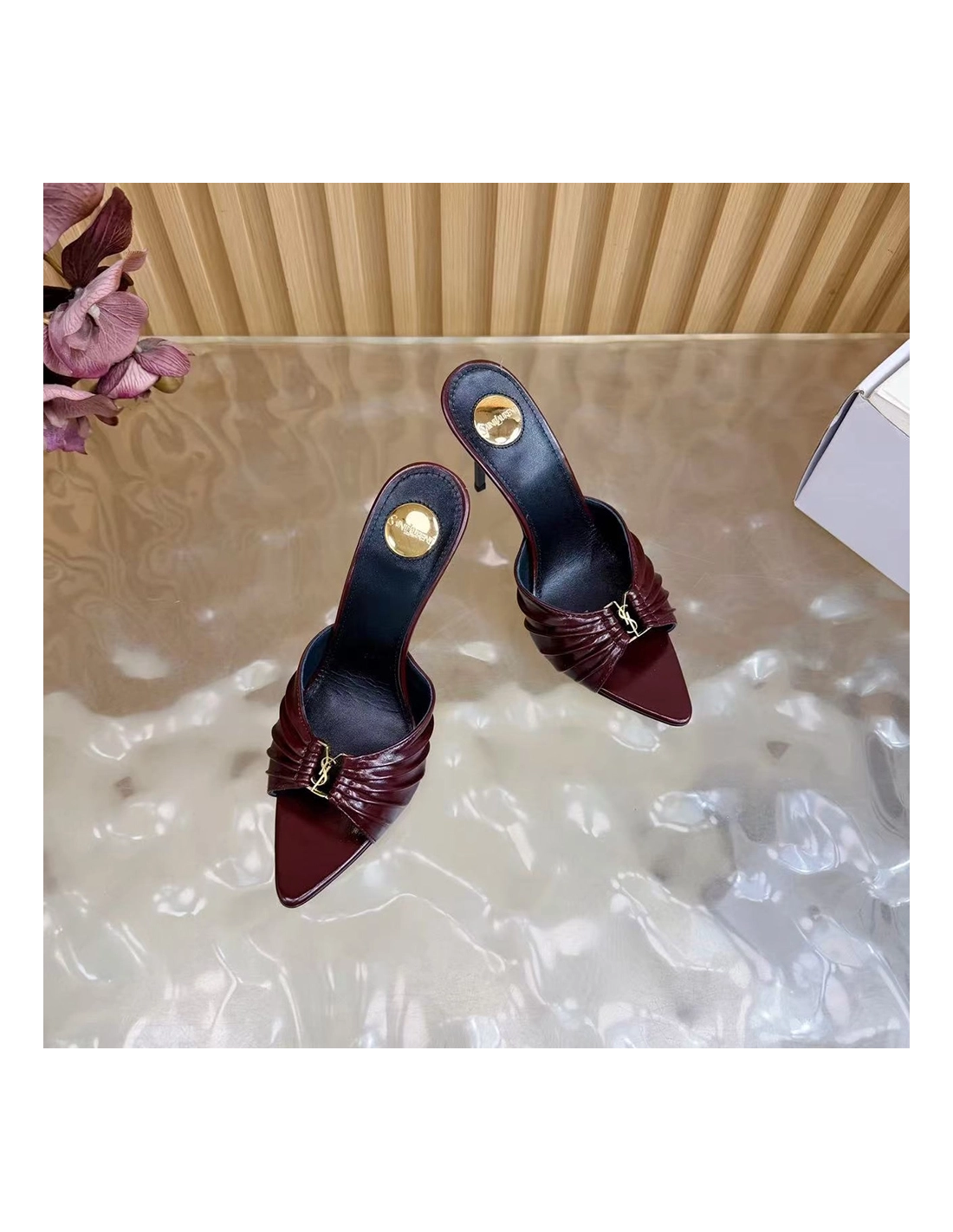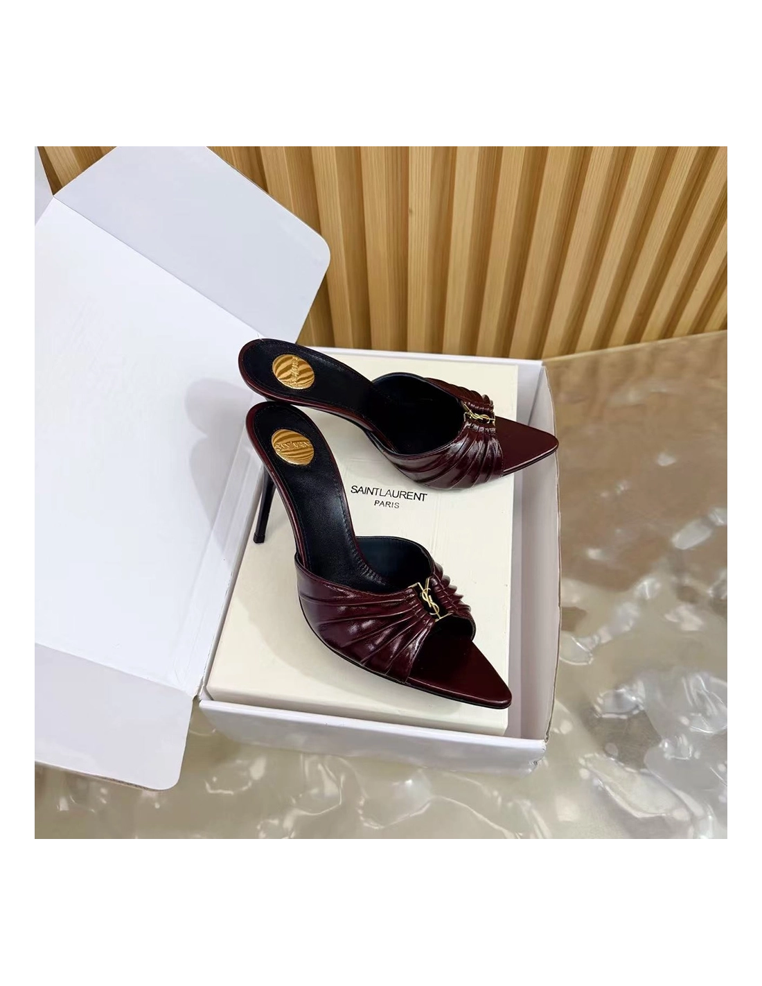Saint Laurent Babylone YSL Ruched Leather Mule Sandals