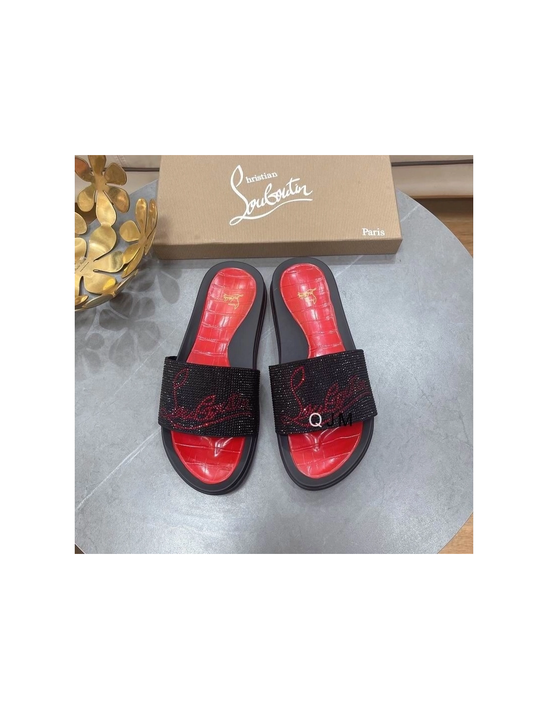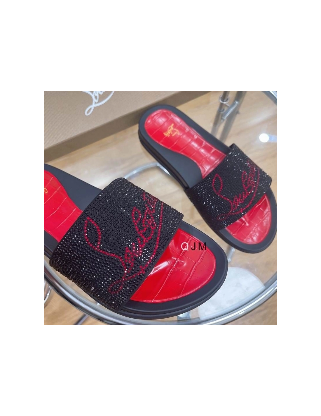 Christian Louboutin Men Slide Sandals Strass Embellishment Rubber Black Red